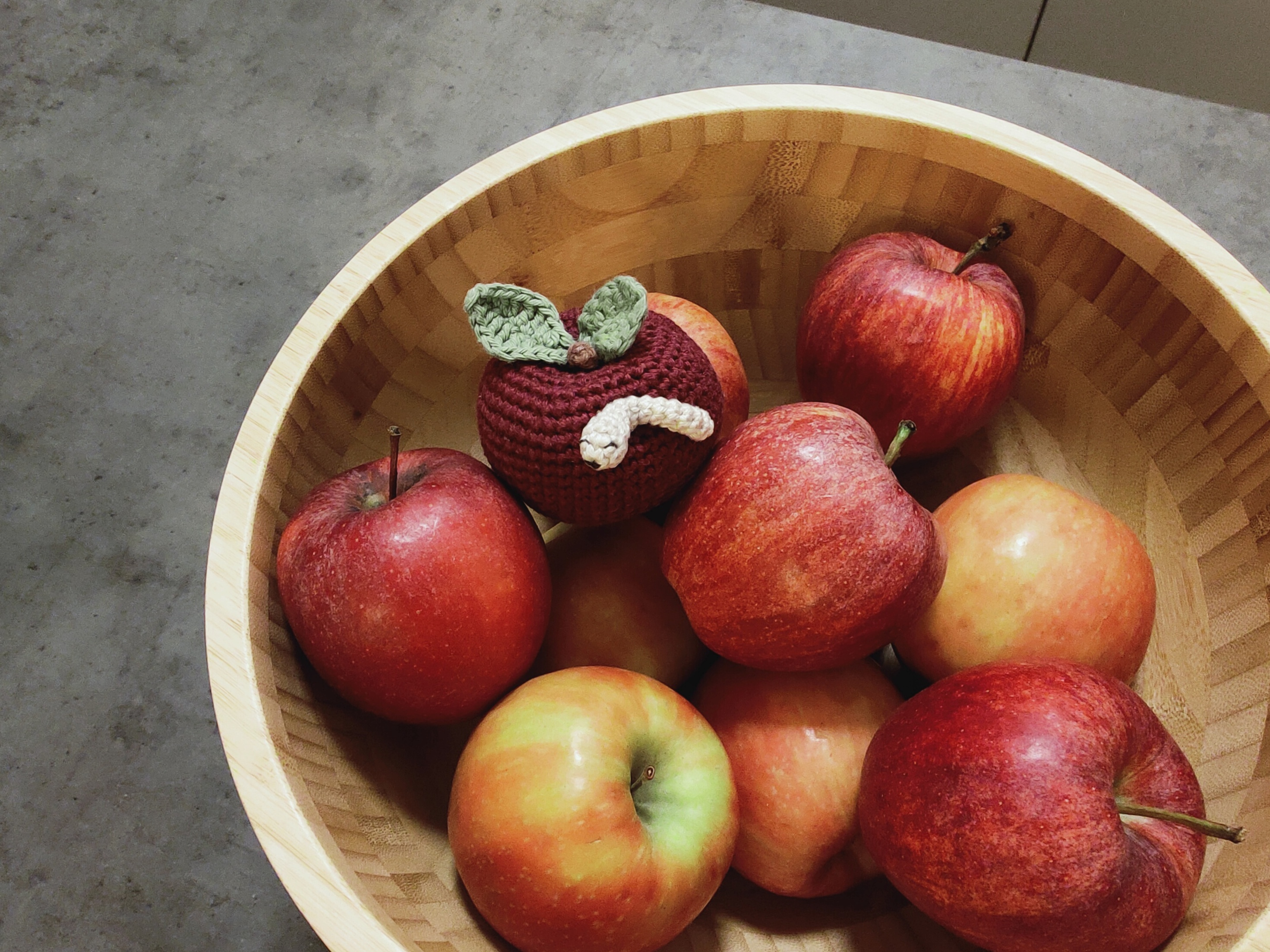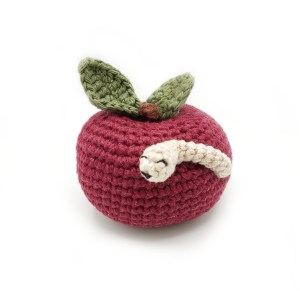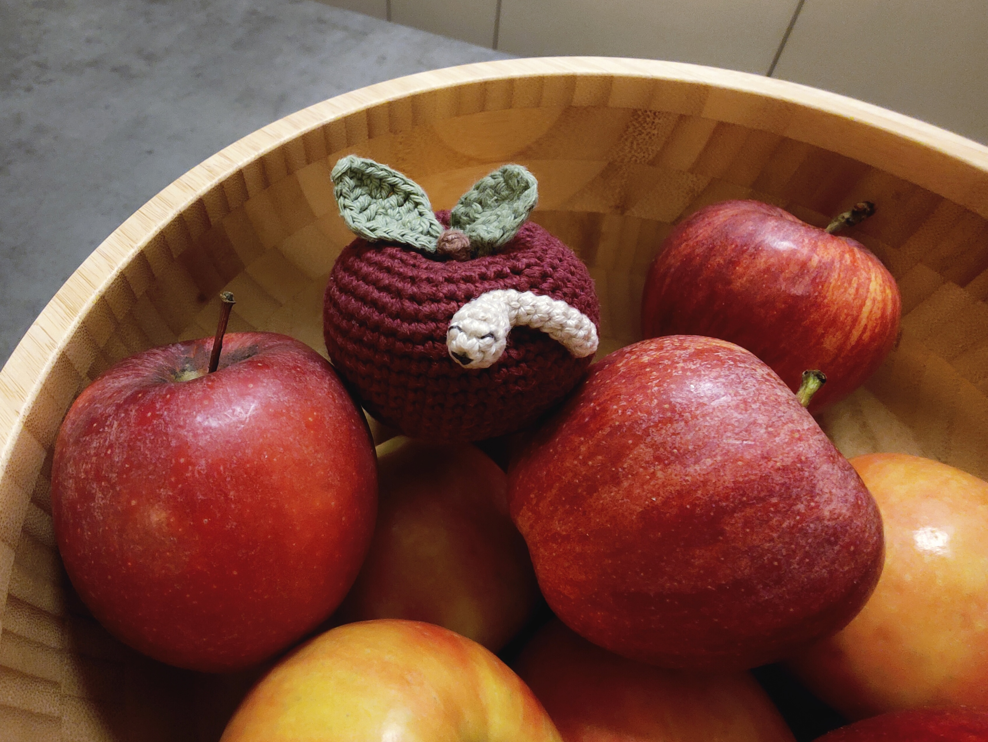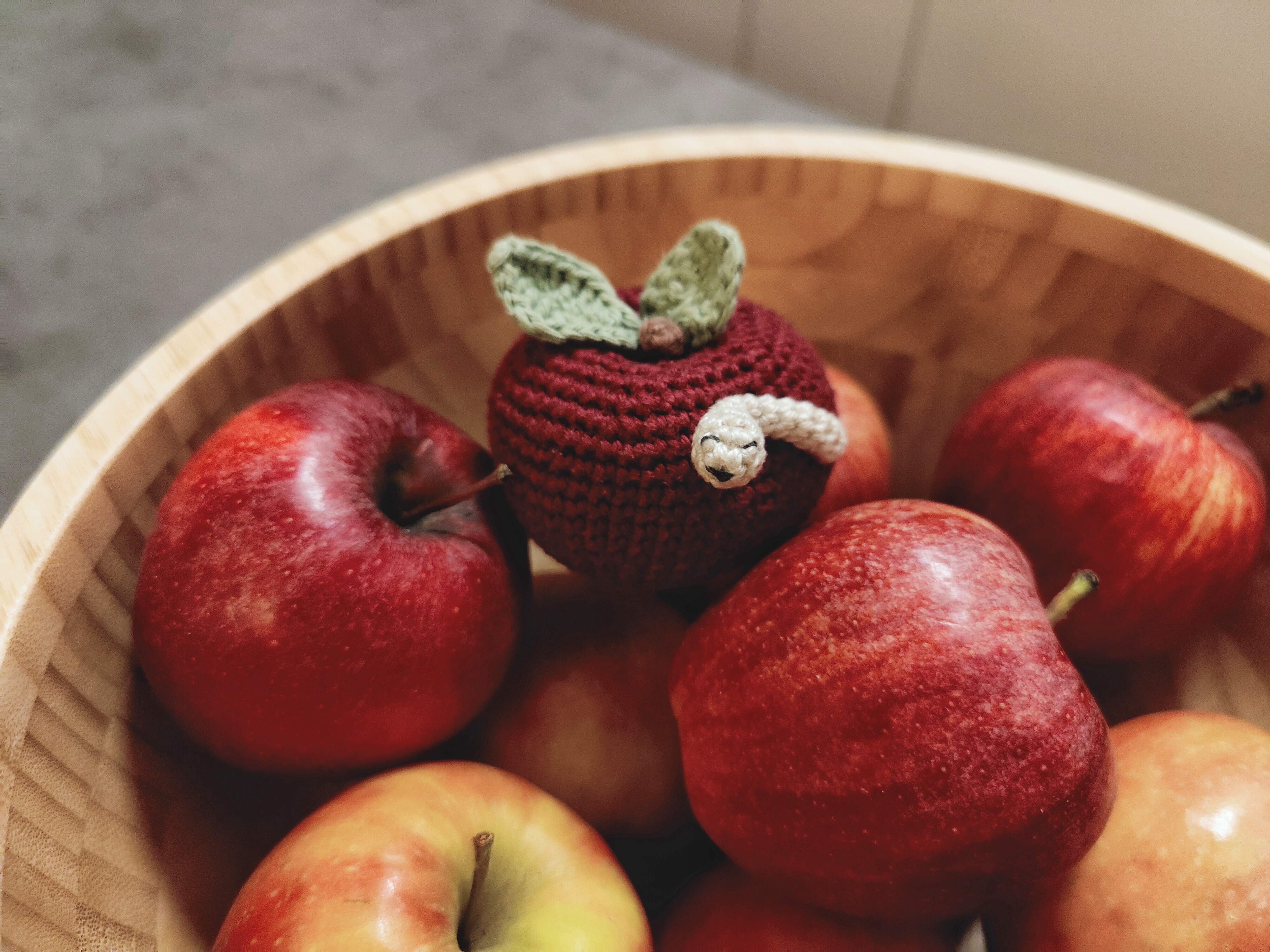 Früchte sind doch was tolles. Sie kombinieren Süße mit Vitaminen. Auch wenn die Nutzung starker Pestizide für den Geschmack und die Gesundheit im Obst fragwürdig ist, Hugo, der kleine Häkelwurm, findet süße Früchte wunderbar. Ganz besonders den Bio Häkelapfel aus der Häkelobst-Kollektion hat es Hugo angetan.