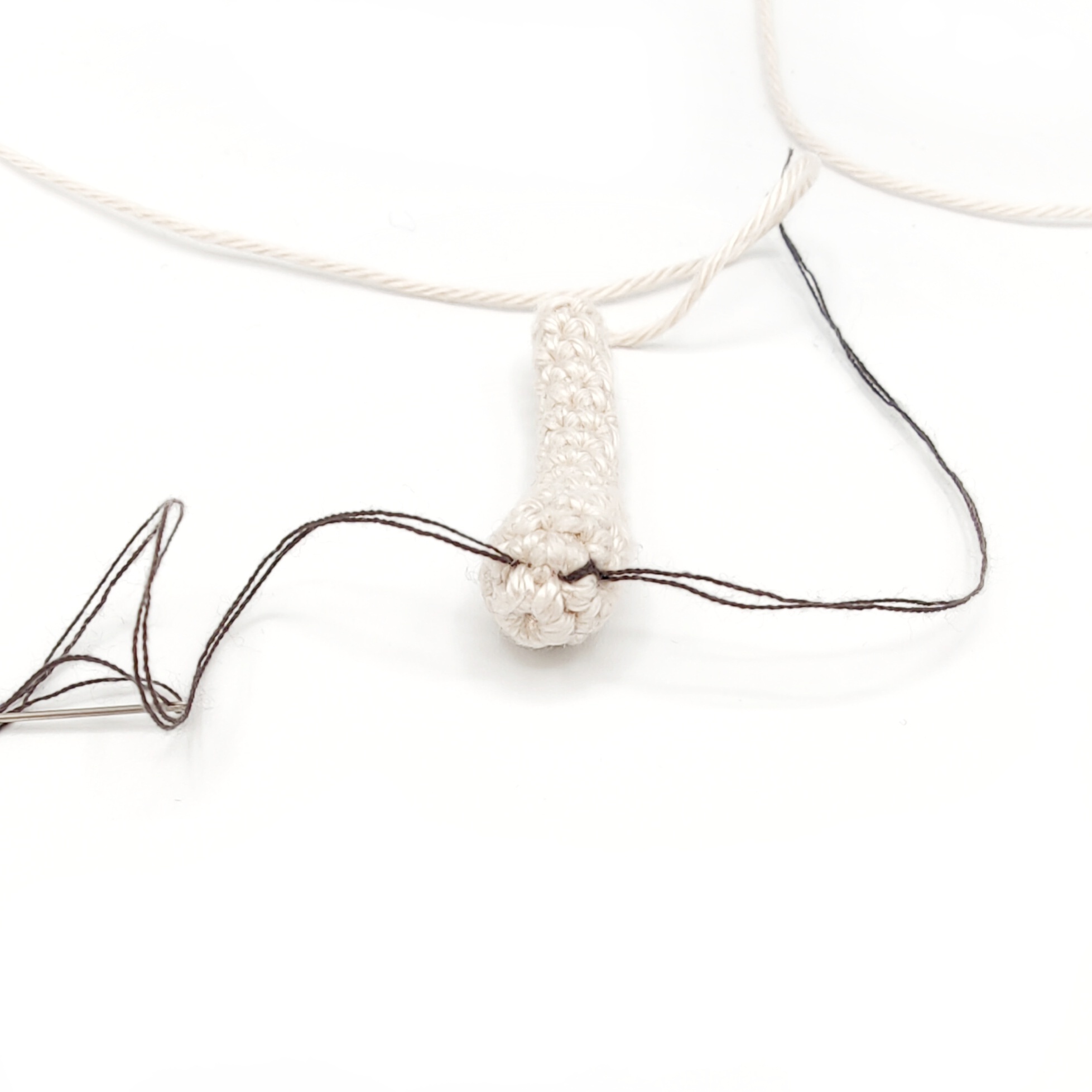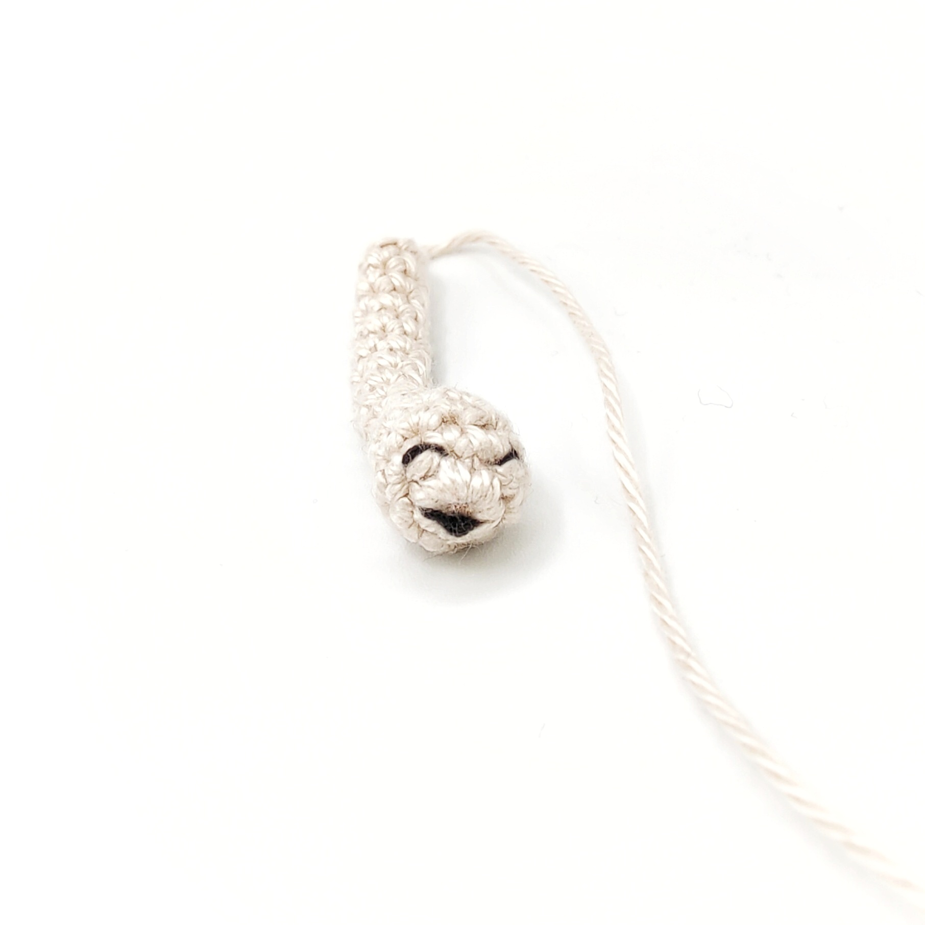 Jetzt nähst du am Wurm die Augen und den Mund mit einer Nähnadel und Nähgarn. Steche dabei die Augen als „Dach“-Form bzw. unten offenes Dreieck durch jeweils eine Masche der 2. Rd des Wurms, wobei zwischen den Augen ein Abstand von 1 Masche freigelassen wird. Nähe den Mund ähnlich (als verkehrtes und oben offenes Dreieck) entlang der 1. Rd des Wurms.