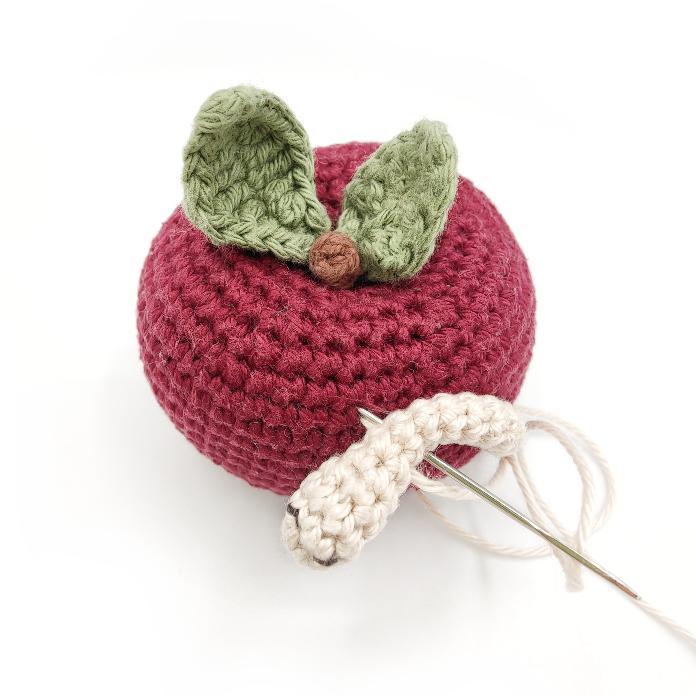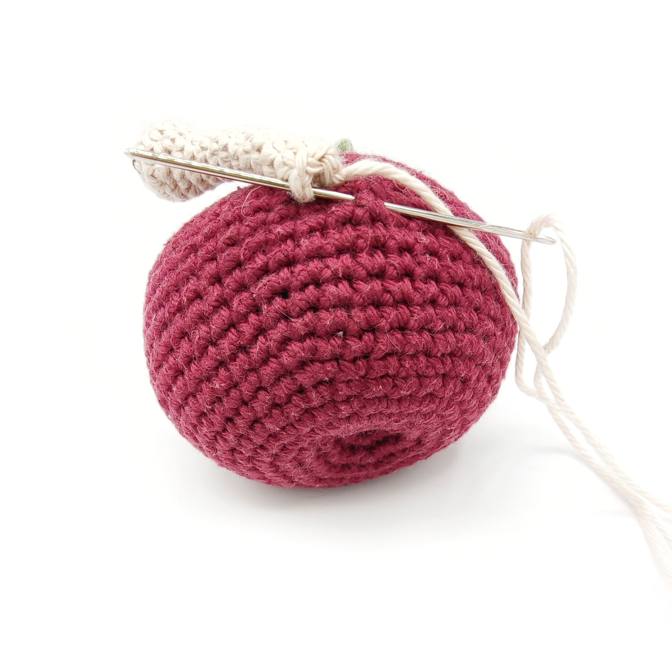 Befestige den nun fertigen Wurm an deinen Häkelapfel. Der Wurmkörper beginnt zwischen der 14. und 15. Rd des Häkelapfels, und die 6. bis 7. Rd des Wurmkopfs wird zwischen die 18. und 19. Rd des Häkelapfels, ca. 5 Maschen entfernt vom Beginn des Wurmkörpers, befestigt.