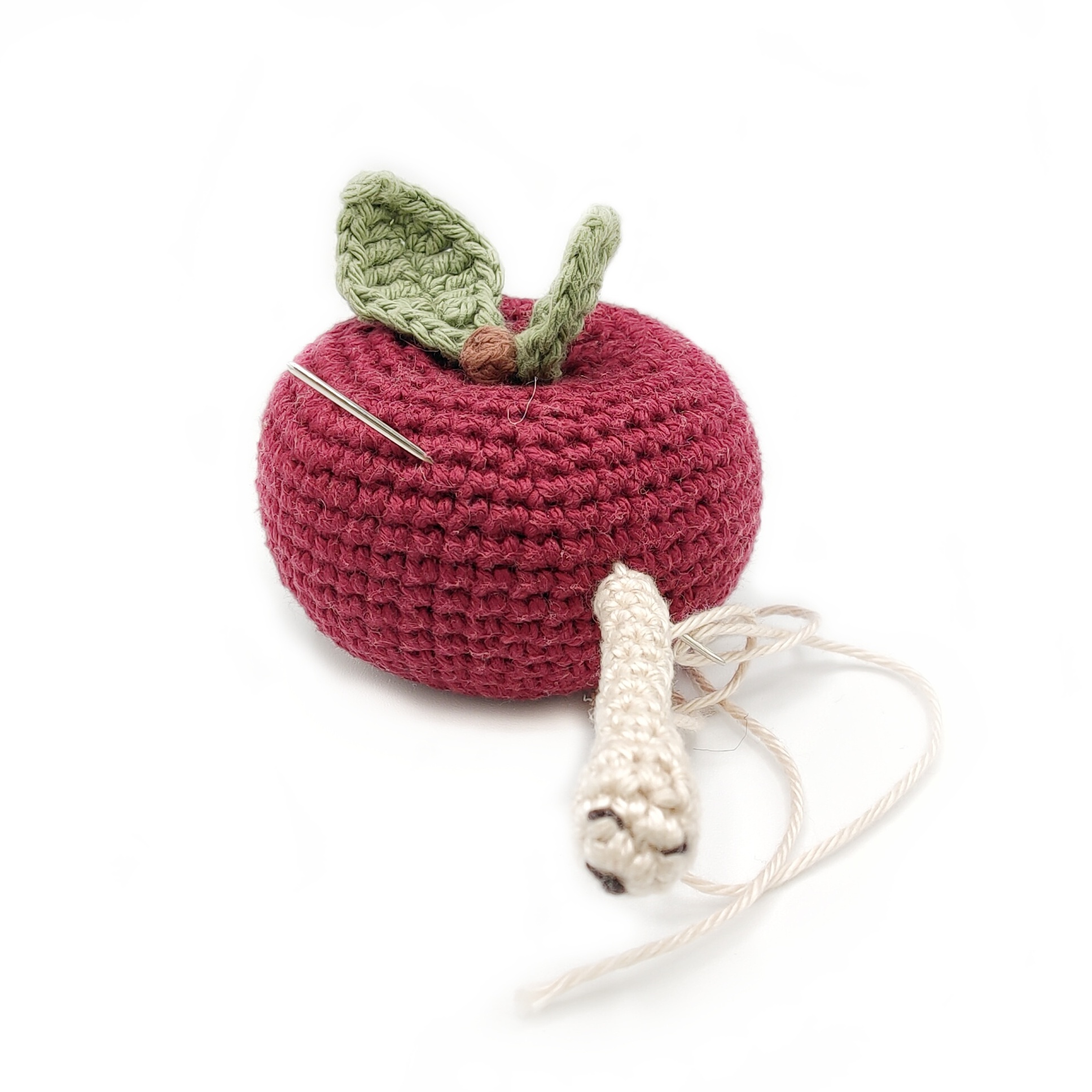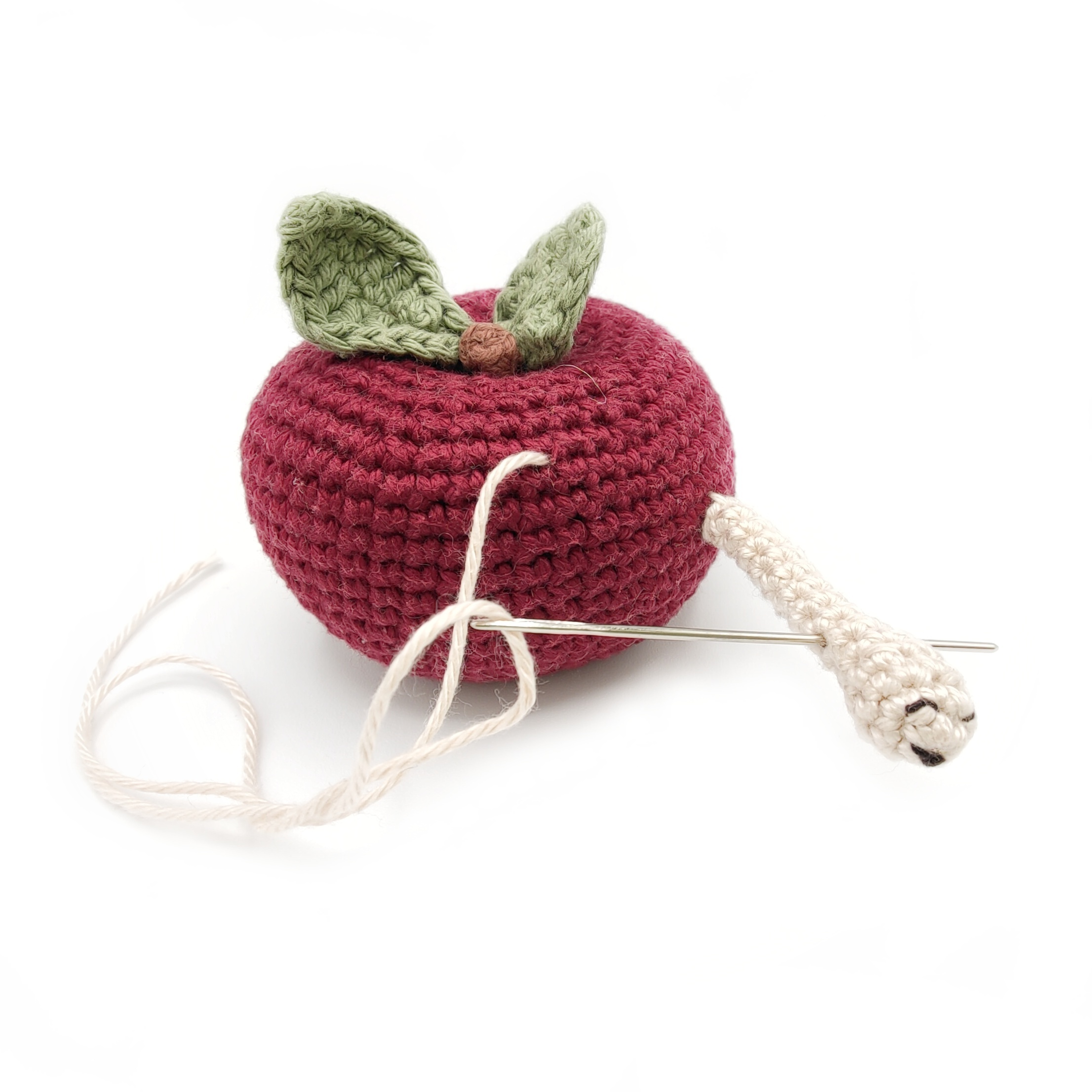 - Garn mit einer empfohlenen Nadelstärke von 2,5-3,5 mm (in rot, grün und braun für den Häkelapfel, und in beige für den Häkelwurm)