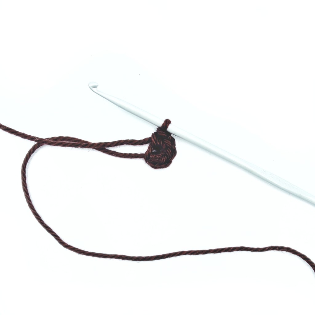 10. R: steche runter in die abm-M der 7. R und häkle 1 KM durch diese M (das faltet die 7. – 9. R zusammen und macht den braunen Teil dicker, was wir für den Stängel wollen)