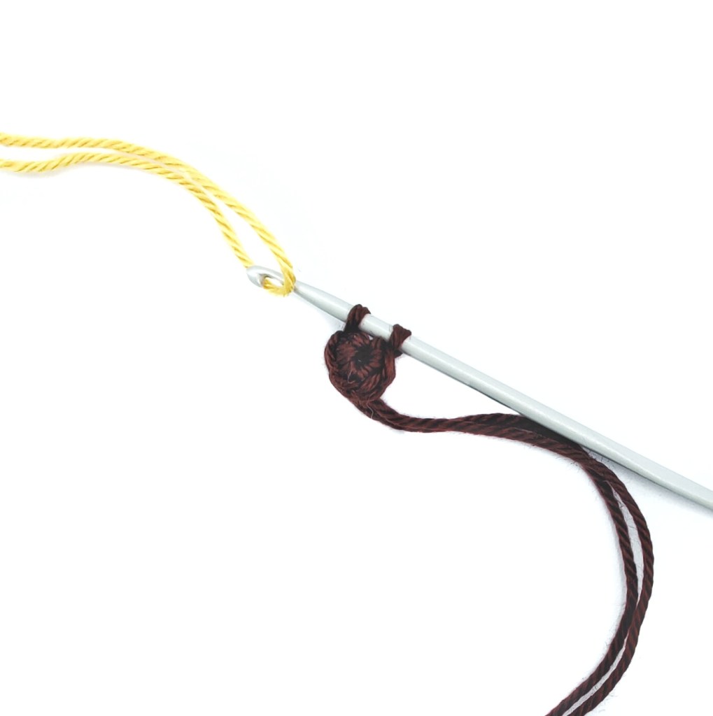 2. Rd: 1 fM in jede M der Rd, in welcher wir gleich in der 1. M die Farbe auf Gelb wechseln (5)