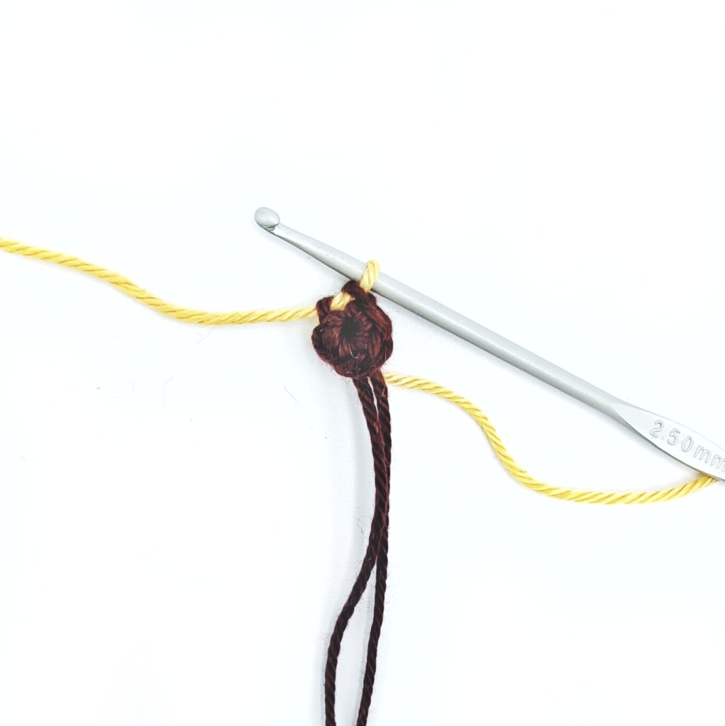 Nimm ein neues gelbes Garn und verknote das Ende.