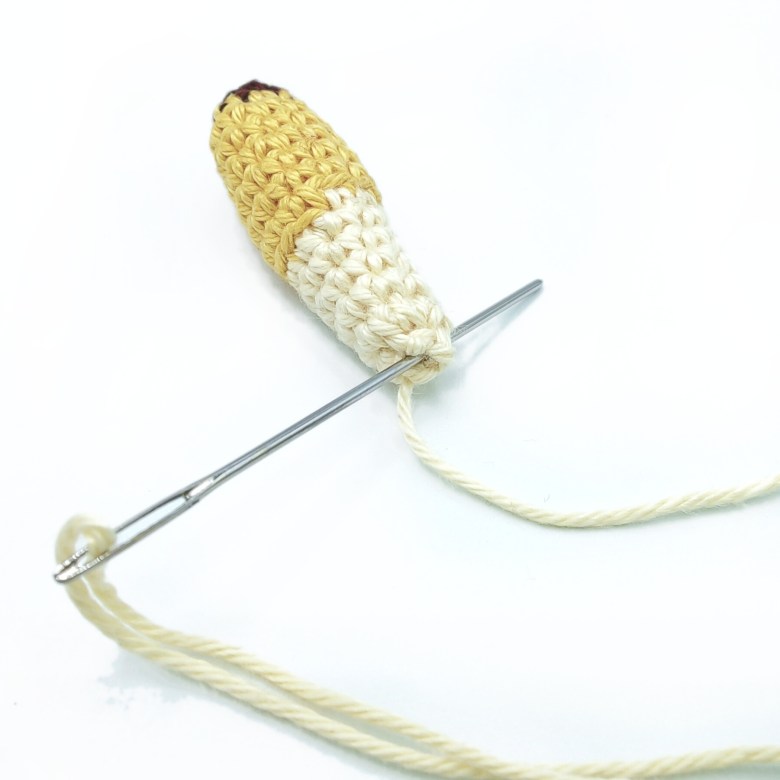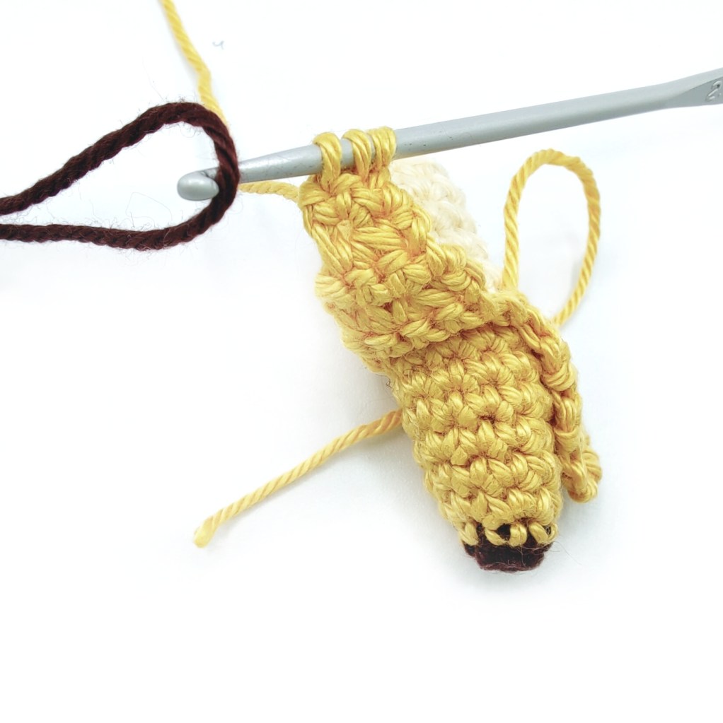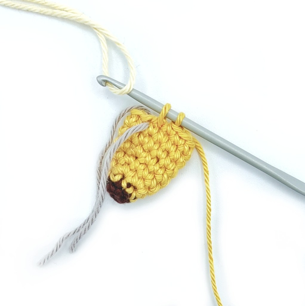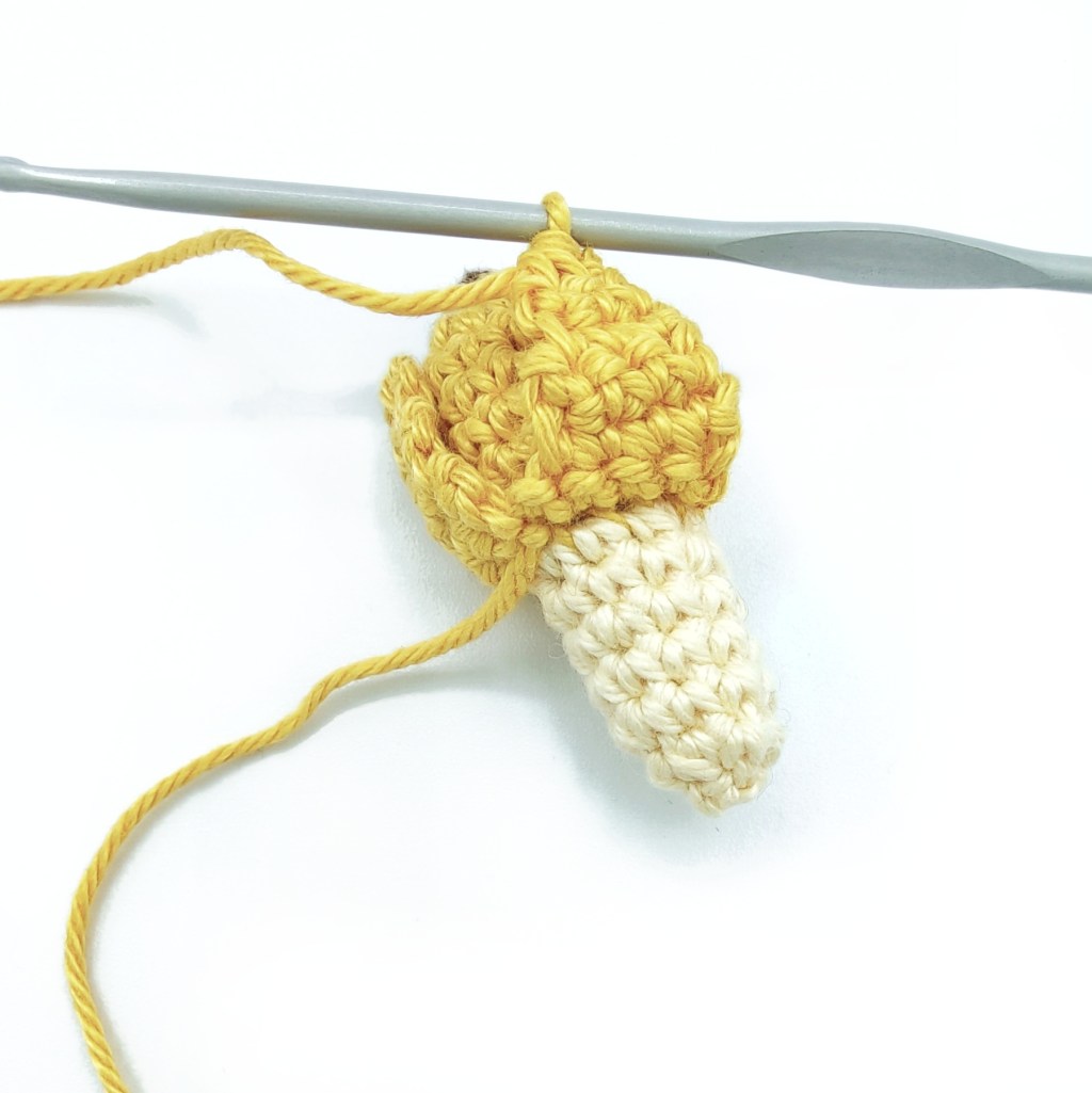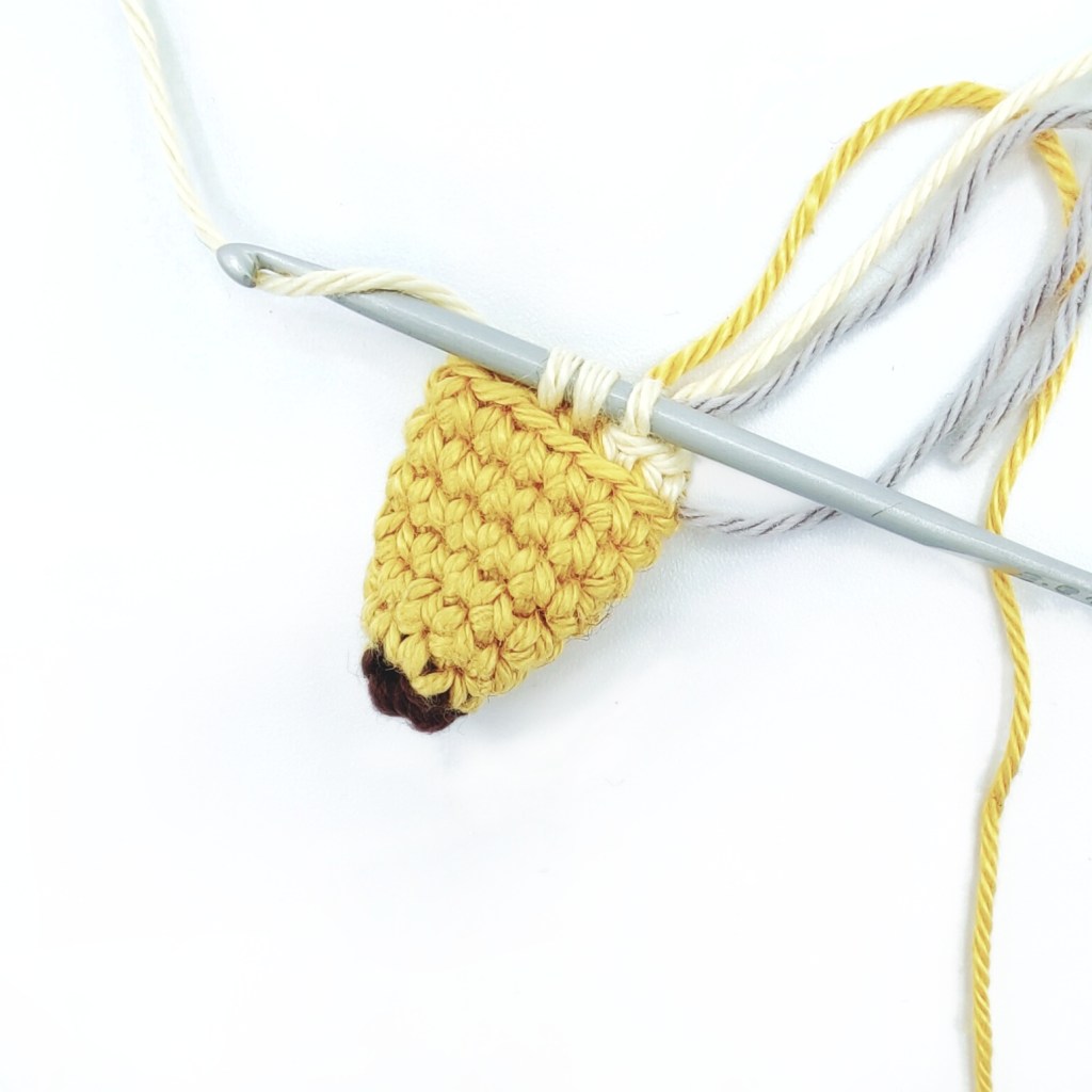 6. – 8. Rd: 1 fM in jede M der Rd, wechsle die Farbe auf ein helleres Gelb in der letzten M der 8. Rd (12)
