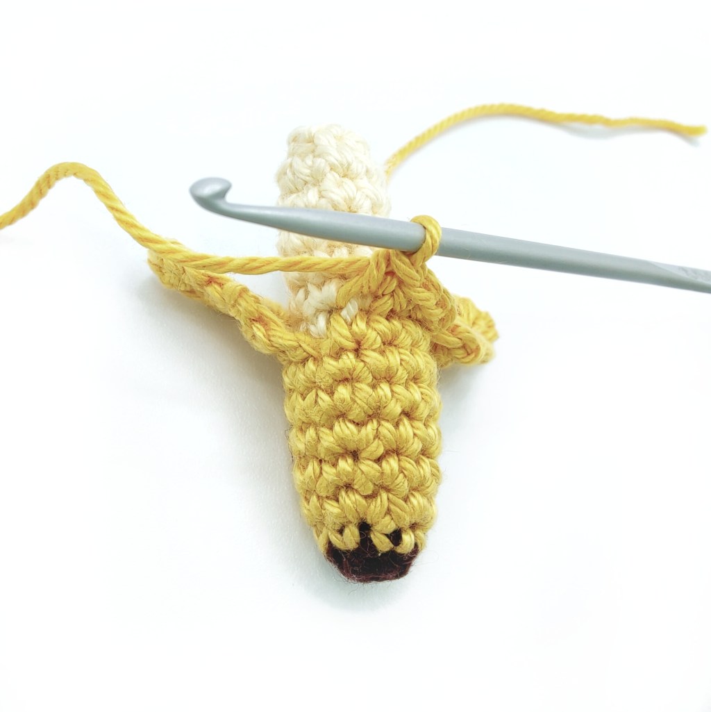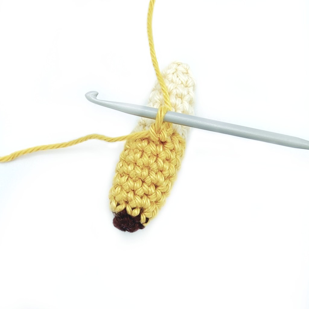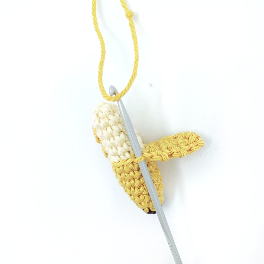 Wir setzen mit den Schalenteilen fort. Diese häkeln wir jeweils mit neuem gelben Garn in Reihen auf die 9. Rd (fM-hMg Rd) der Banane: