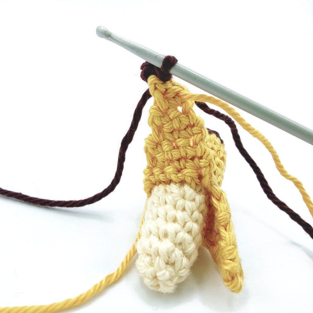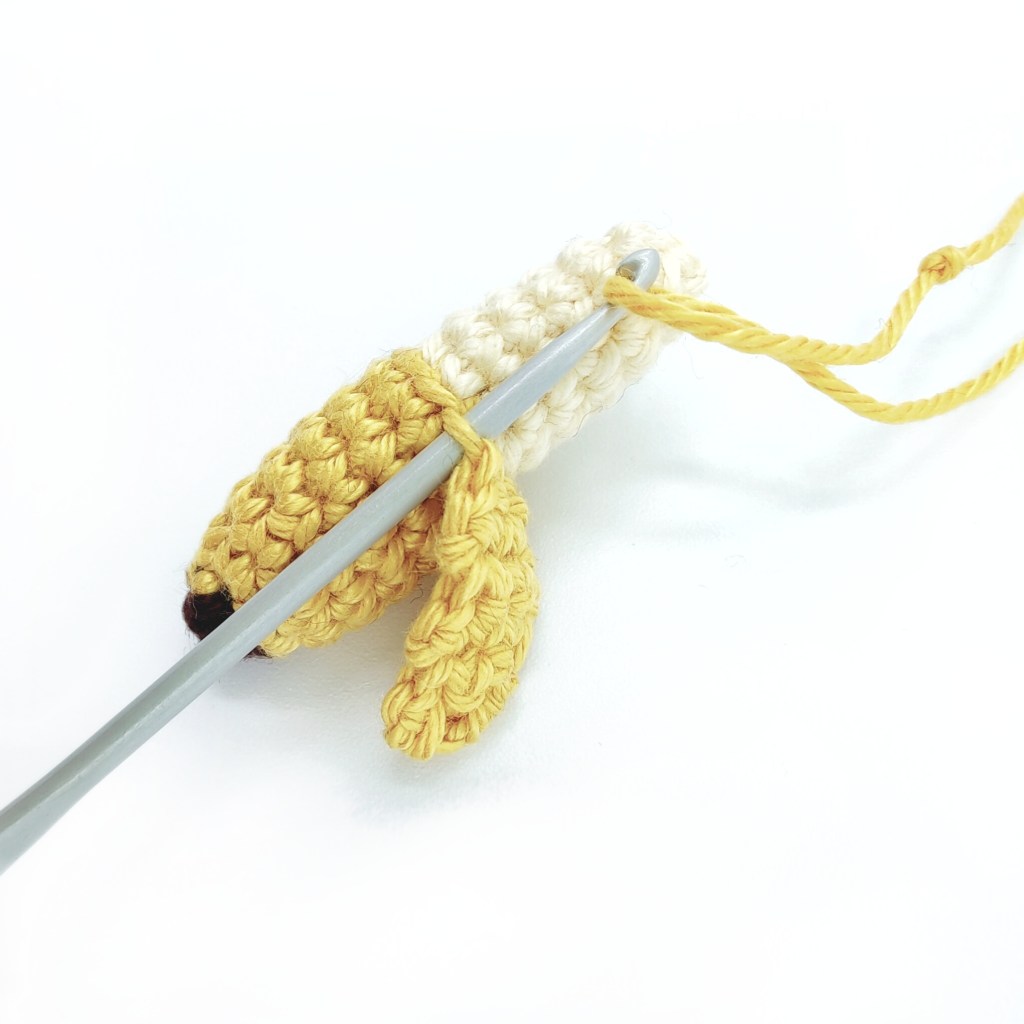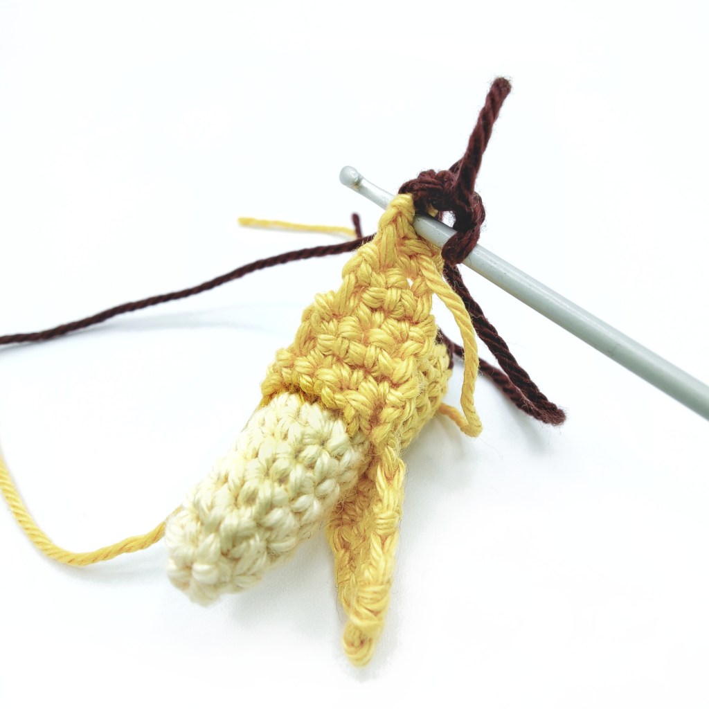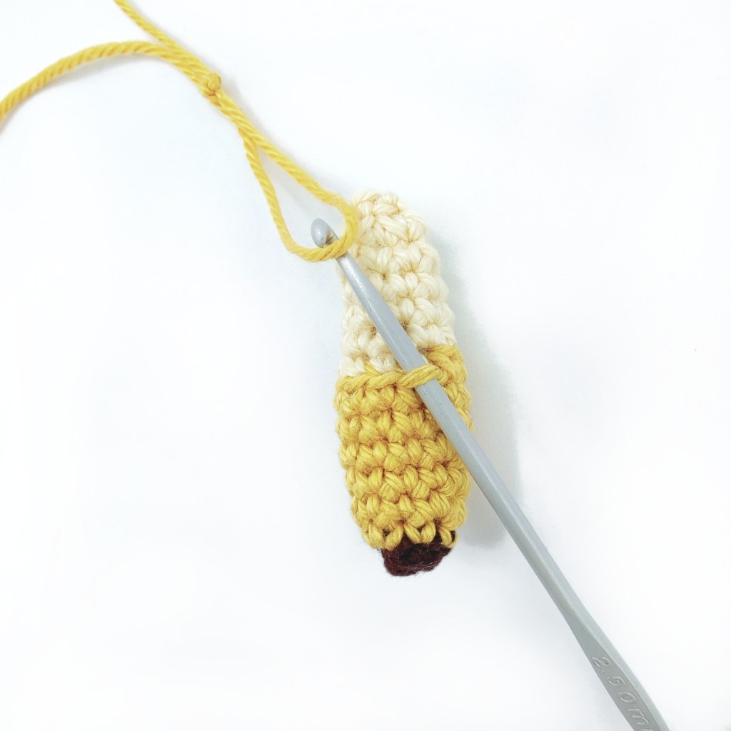 Wir setzen mit den Schalenteilen fort. Diese häkeln wir jeweils mit neuem gelben Garn in Reihen auf die 9. Rd (fM-hMg Rd) der Banane: