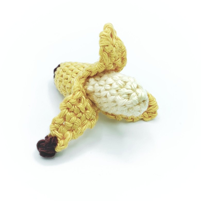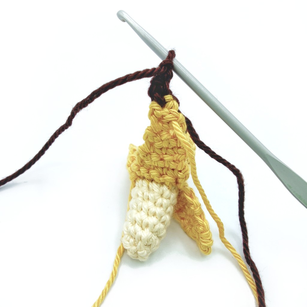 Wir häkeln die Banane von der Frucht in der Schale bis zum geschälten Ende, das aus 3 Schalenteilen besteht. Die Schalenteile häkeln wir jeweils mit neuem Garn auf der Frucht.