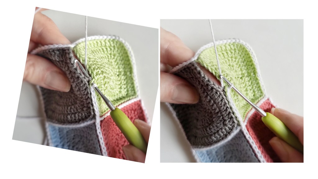Variante 2, wie man Teile schön ohne Annähen verbinden kann: verbinde die gegenüberliegenden inneren Maschenglieder mit einer Kettmasche. So können flache Teile, wie z.B. Granny Squares, wunderschön und unscheinbar flach verbunden werden.