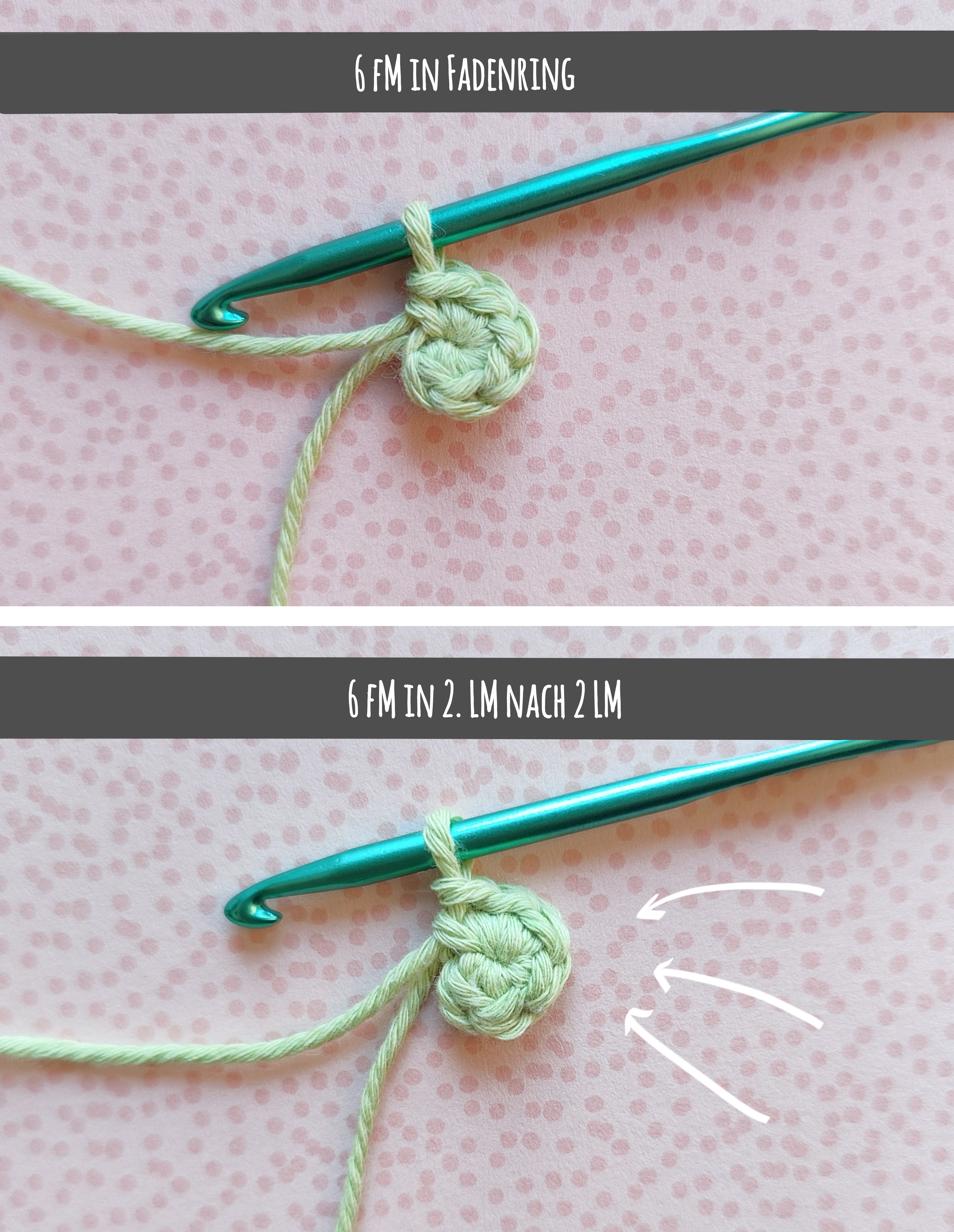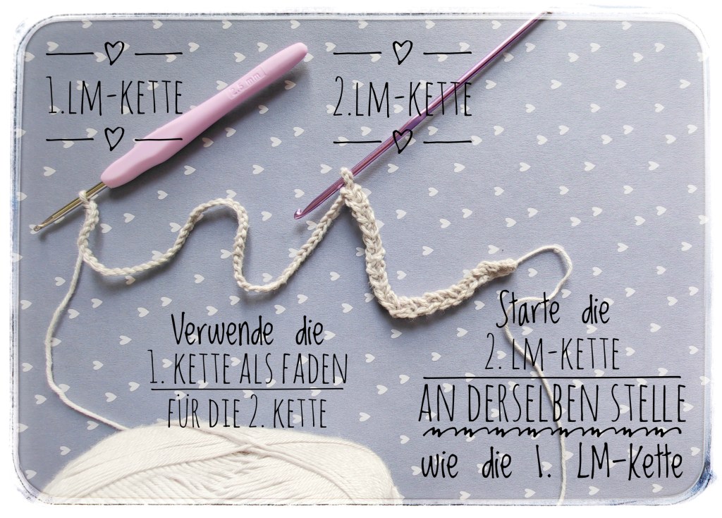 Mit 2 LM zu beginnen ist nicht nur einfacher (vorallem beim Micro-Häkeln!), sondern sieht auch besser aus, wenn du mit uneinheitlichem Boucle-Garn häkelst und ist die empfehlenswerte Variante, wenn du mit nicht-reissfestem Garn wie Wolle arbeitest. Wichtig ist dabei, so wie beim Fadenring musst du am Ende deiner 1. Runde am Fadenende ziehen, damit sich die 1. Luftmasche um die Maschen schließt.