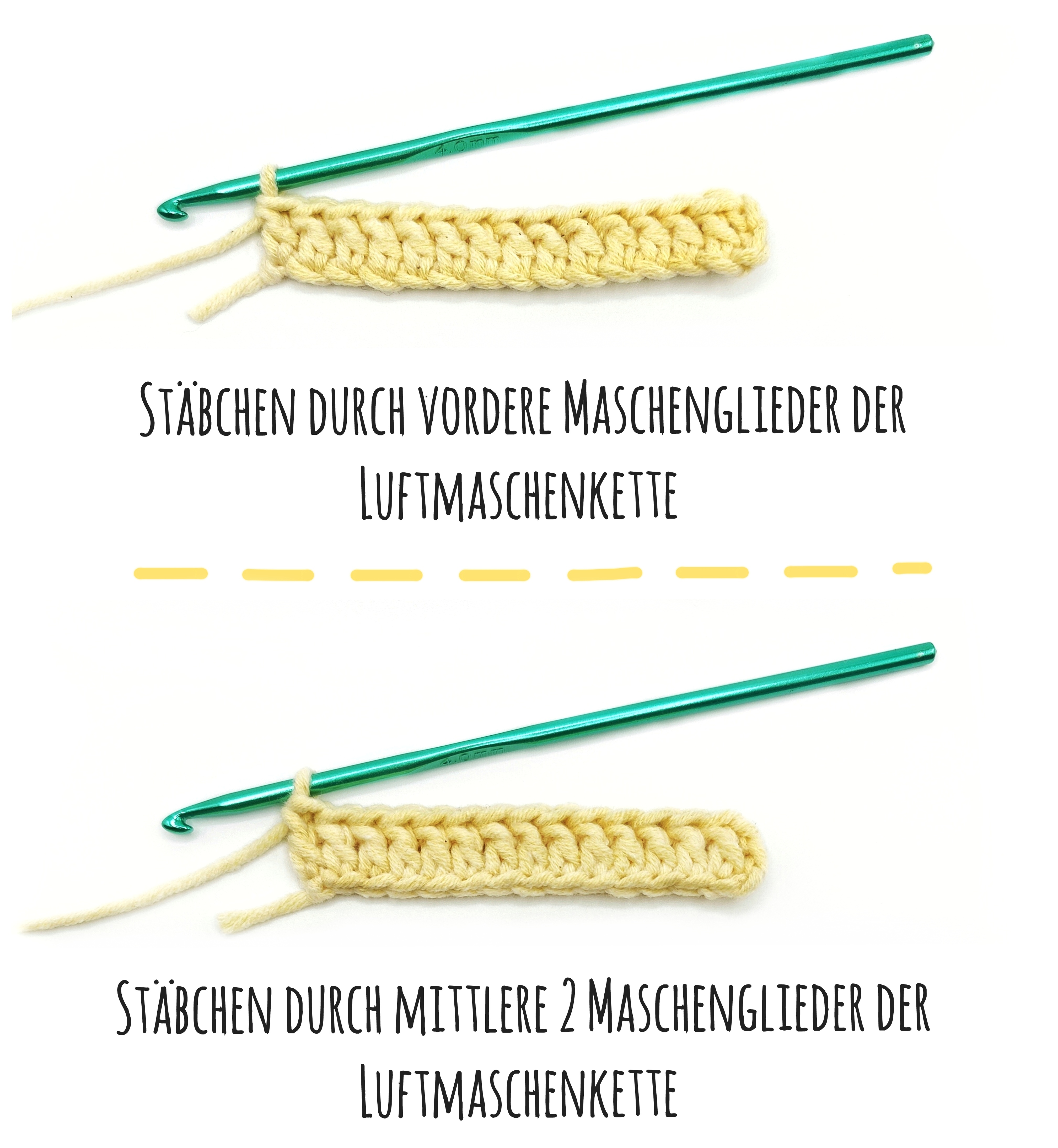 Vorbei sind die Zeiten, in denen man ewig lange an der richtigen Länge der Luftmaschenkette sitzt oder Luftmaschen versehentlich übersieht. Aber der wichtigste Vorteil der Fußschlinge: du beginnst deine Arbeit gleich in der richtigen Spannung der übrigens Reihen, die du bei einer einfachen Luftmaschenkette erst nach der 1. Reihe bekommst.