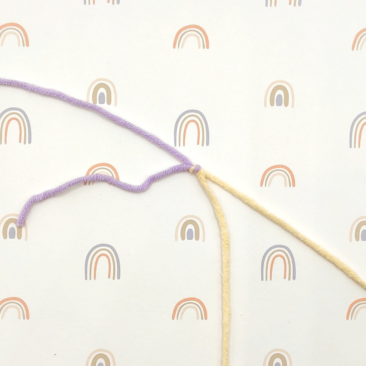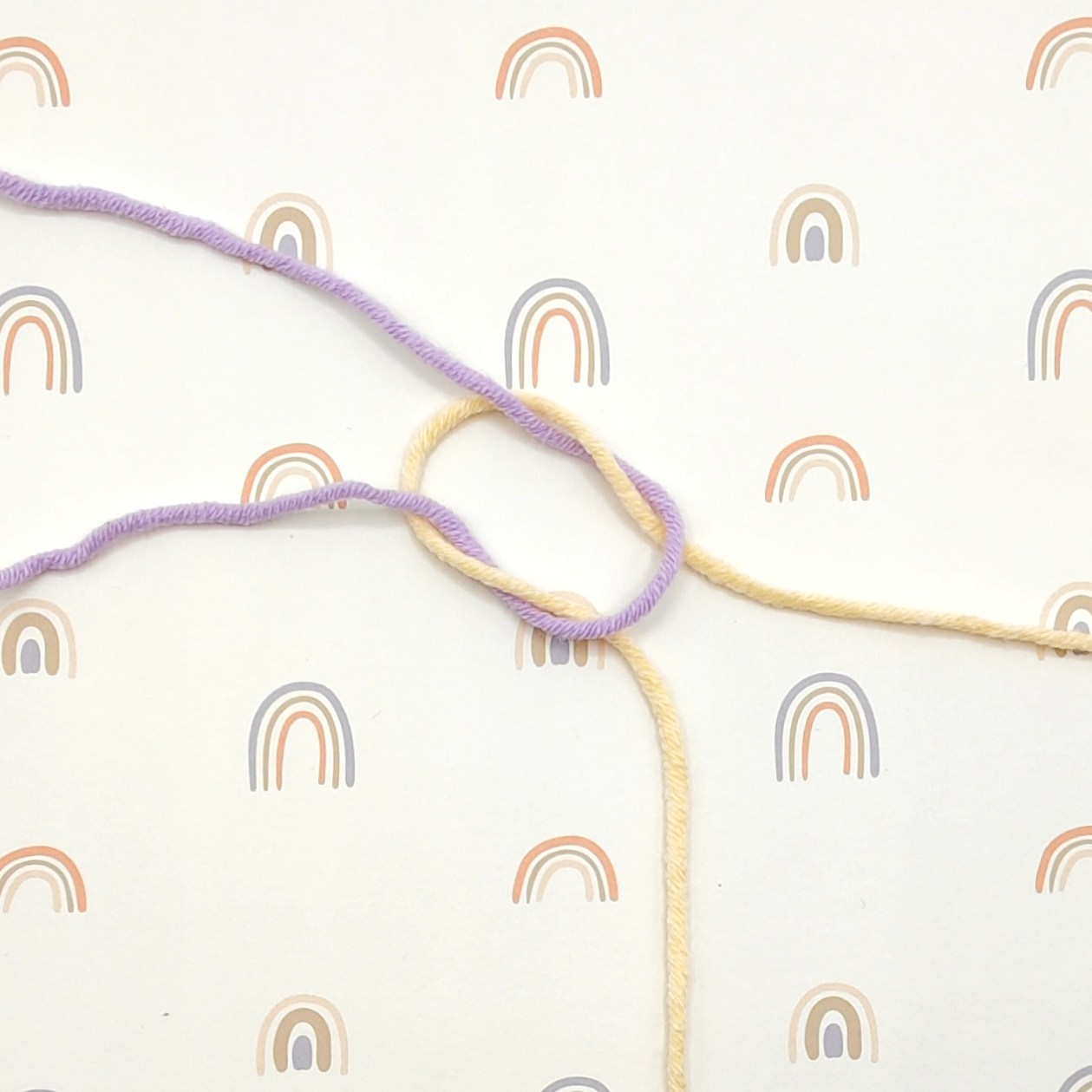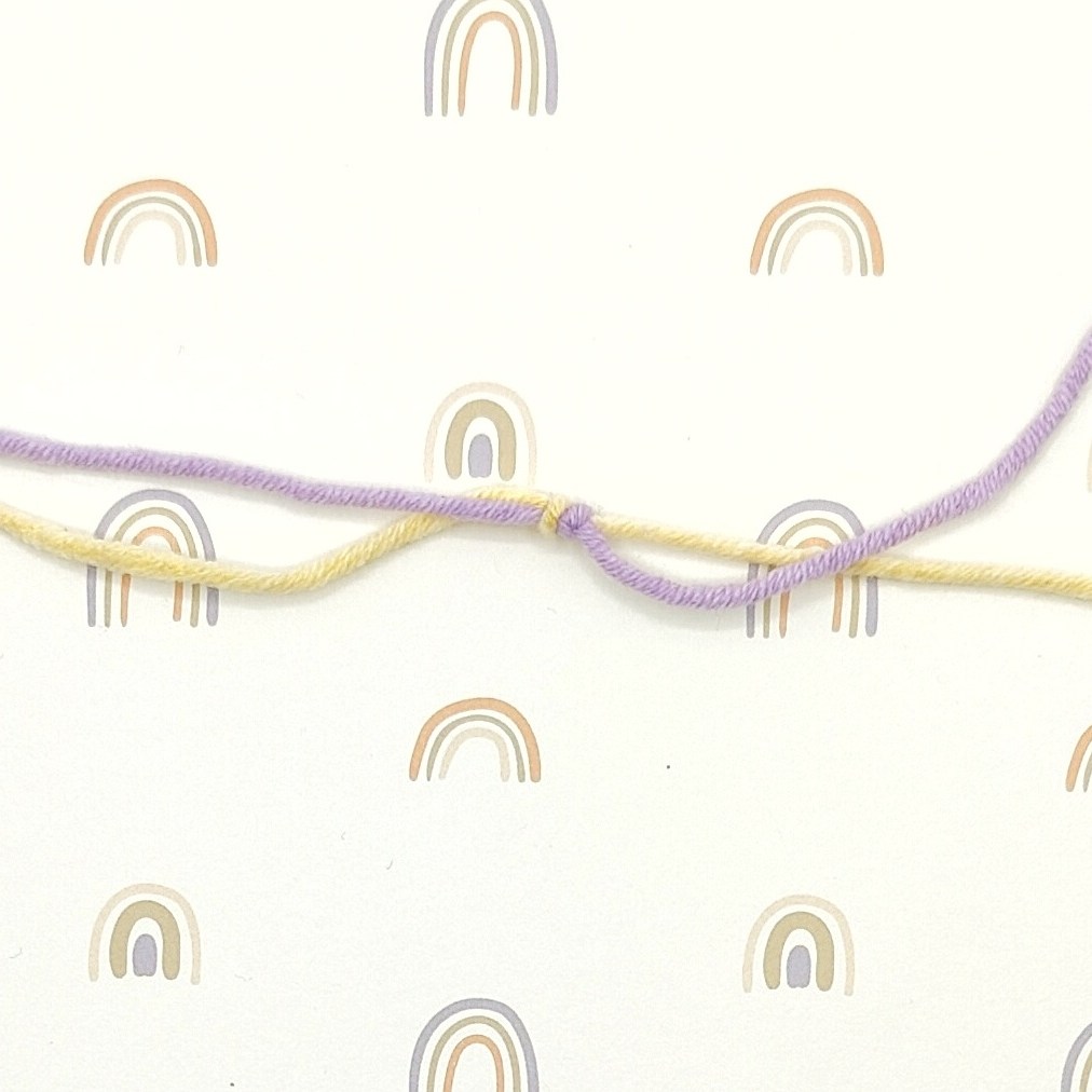 Mit dem Parallel-Knoten, Variante 1, lassen sich die meisten Garne fest verbinden und so knapp abschneiden, dass kein Vernähen notwendig ist und nichts übersteht. Verknote das eine Ende mit sich selbst um das andere Stück Garn und ziehe fest zusammen.