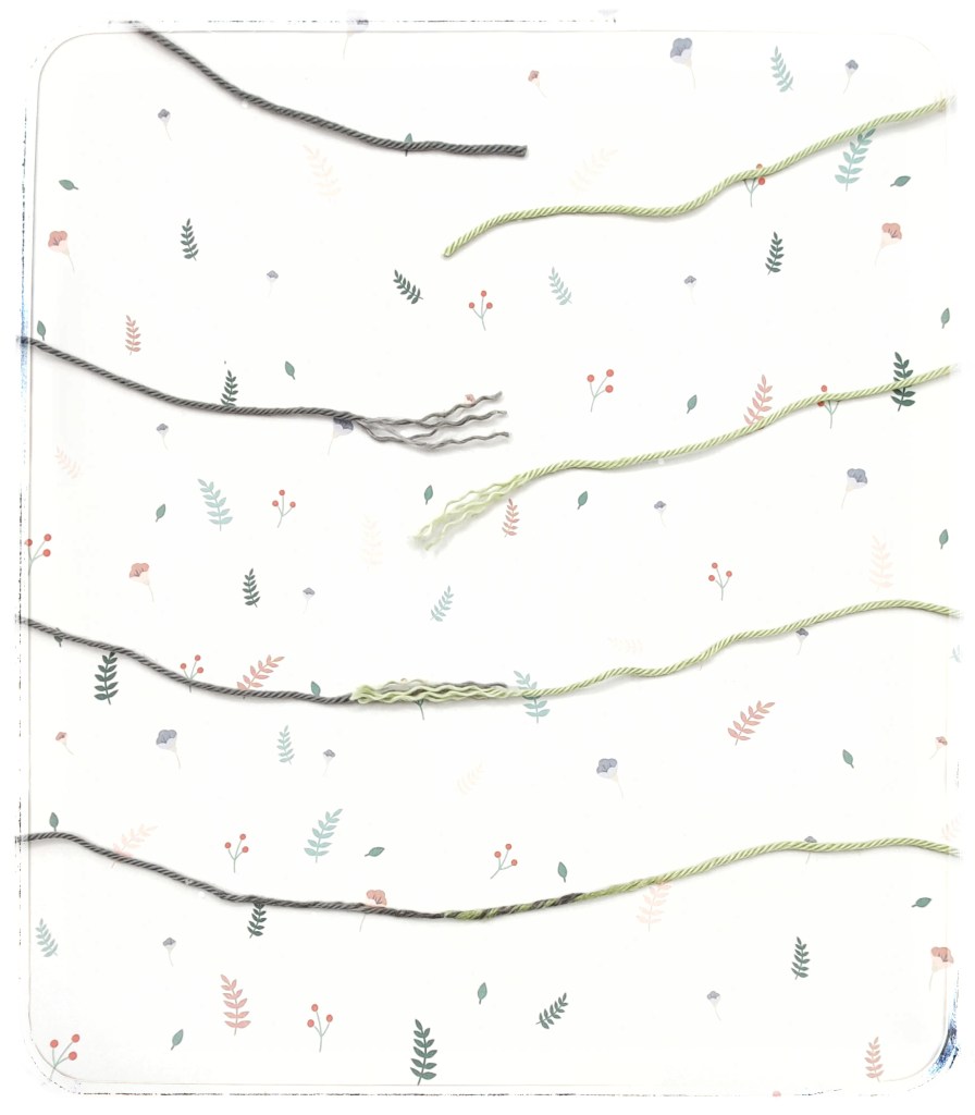 Variante 1 und Variante 2 eignen sich nicht so wunderbar für Wolle oder Garn, das beim Festziehen leicht reissen kann. Für diese Fälle gibt es auch eine wunderschöne Lösung: spalte die Fadenenden, lege sie ineinander und rolle mit den (etwas angefeuchteten) Fingern die Einzelstränge zusammen: