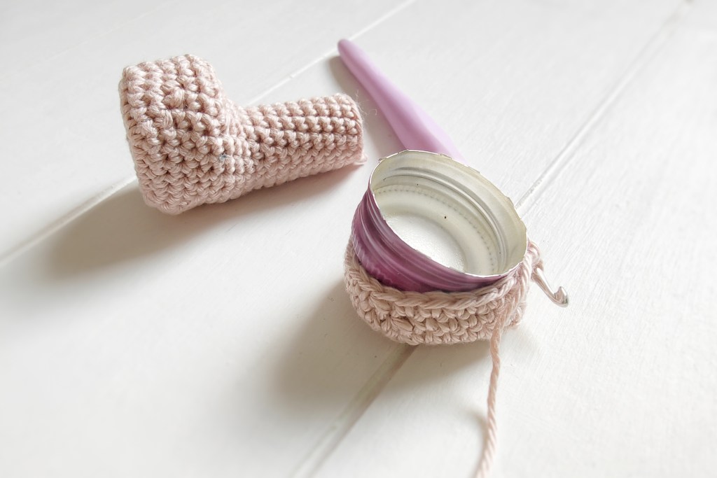 Deckel von Plastik- oder Glasflaschen wiederverwenden hilft der Umwelt und deinen Amigurumis. Sie sind nämlich ein idealer Weg, damit Amigurumis stabil stehen können. Setze den Deckel einfach in den Häkelfuß ein, bevor du zum Bein übergehst und den Fuß mit Füllwatte befüllst.