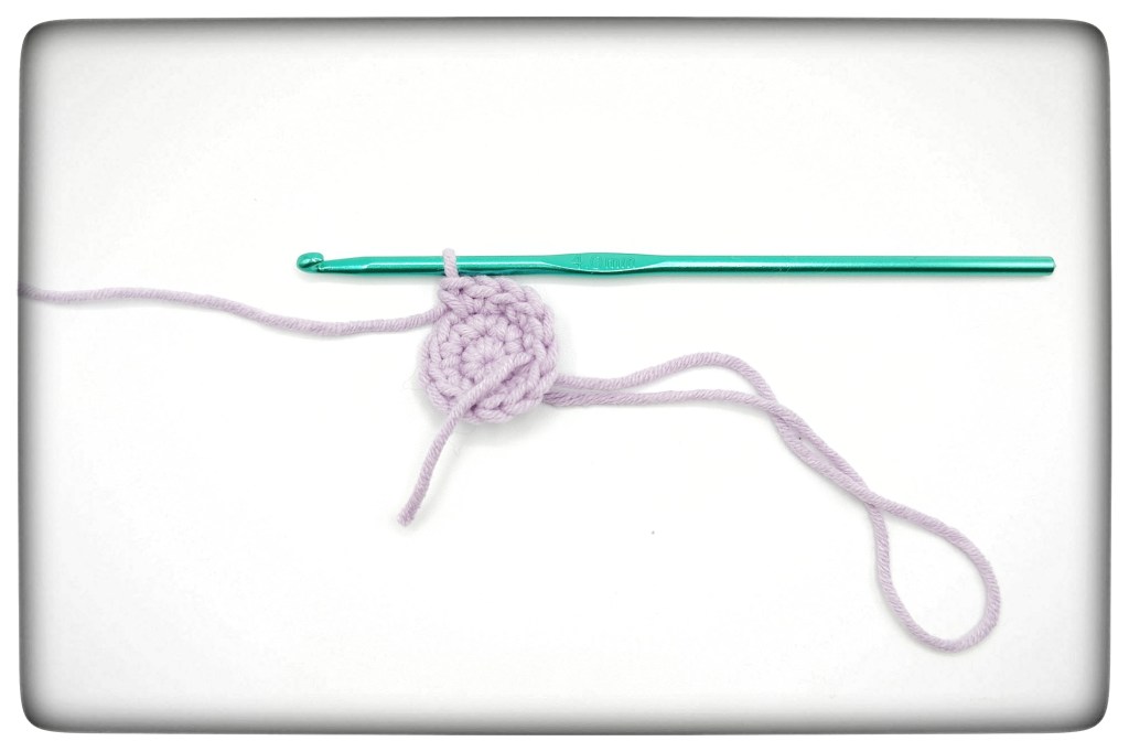 - Am Fadenring verbinde zur 1. Masche mit einer Kettmasche.