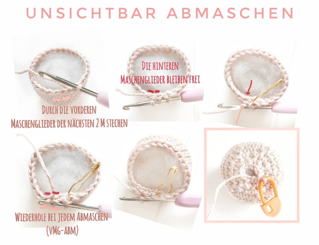 Amigurumi-Häkler werden diesen Häkeltrick vielleicht schon kennen: zwei Maschen in einer Masche zusammenhäkeln, sodass man den Abmasch-Stich kaum sieht. Oder kurz: unsichtbar abmaschen. Wie das geht: häkle die nächsten 2 Maschen einfach nur über die vorderen Maschenglieder zusammen. So wird der Abmaschstich dünner und weniger auffällig. Ideal für Amigurumi-Köpfe.