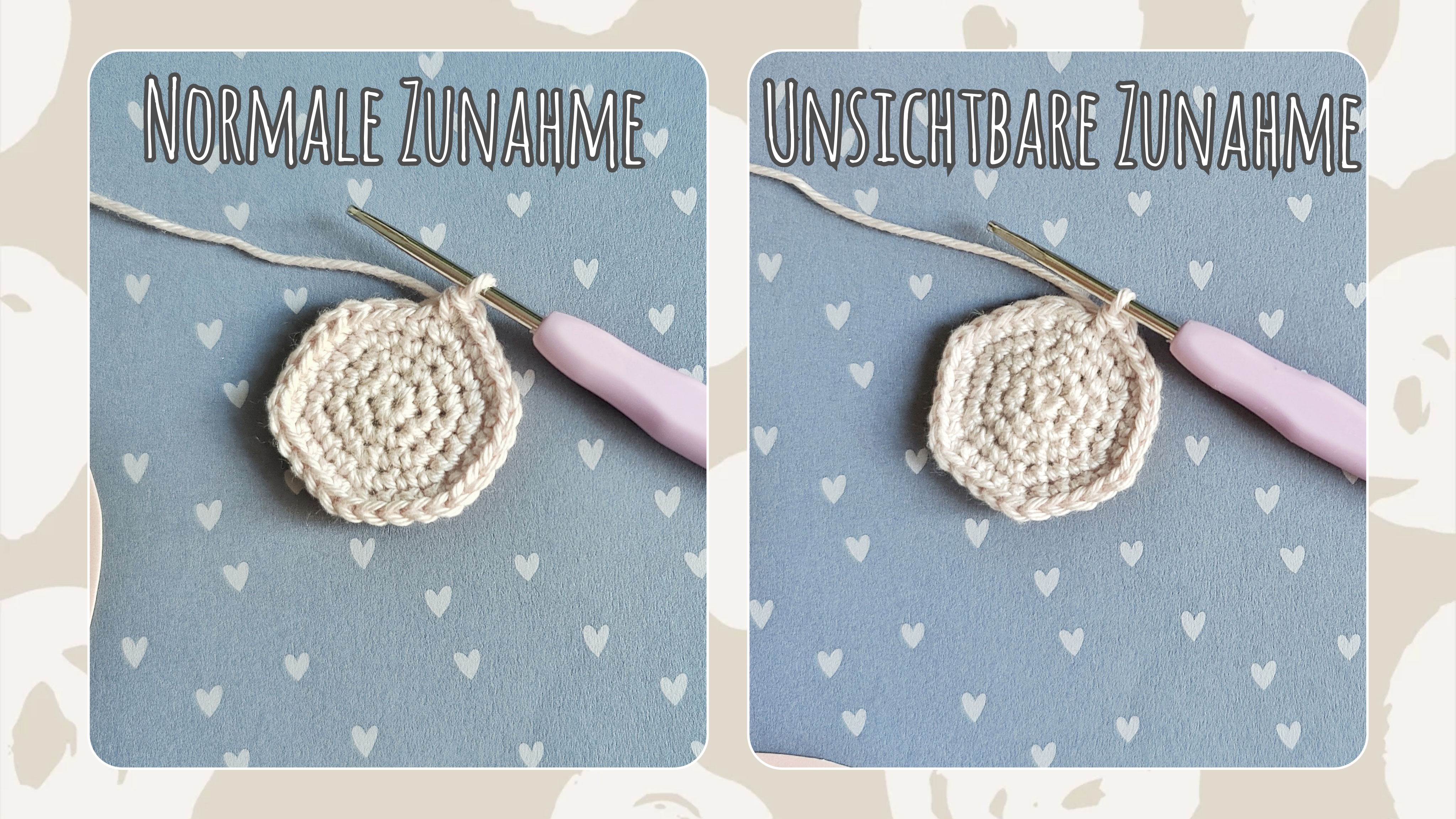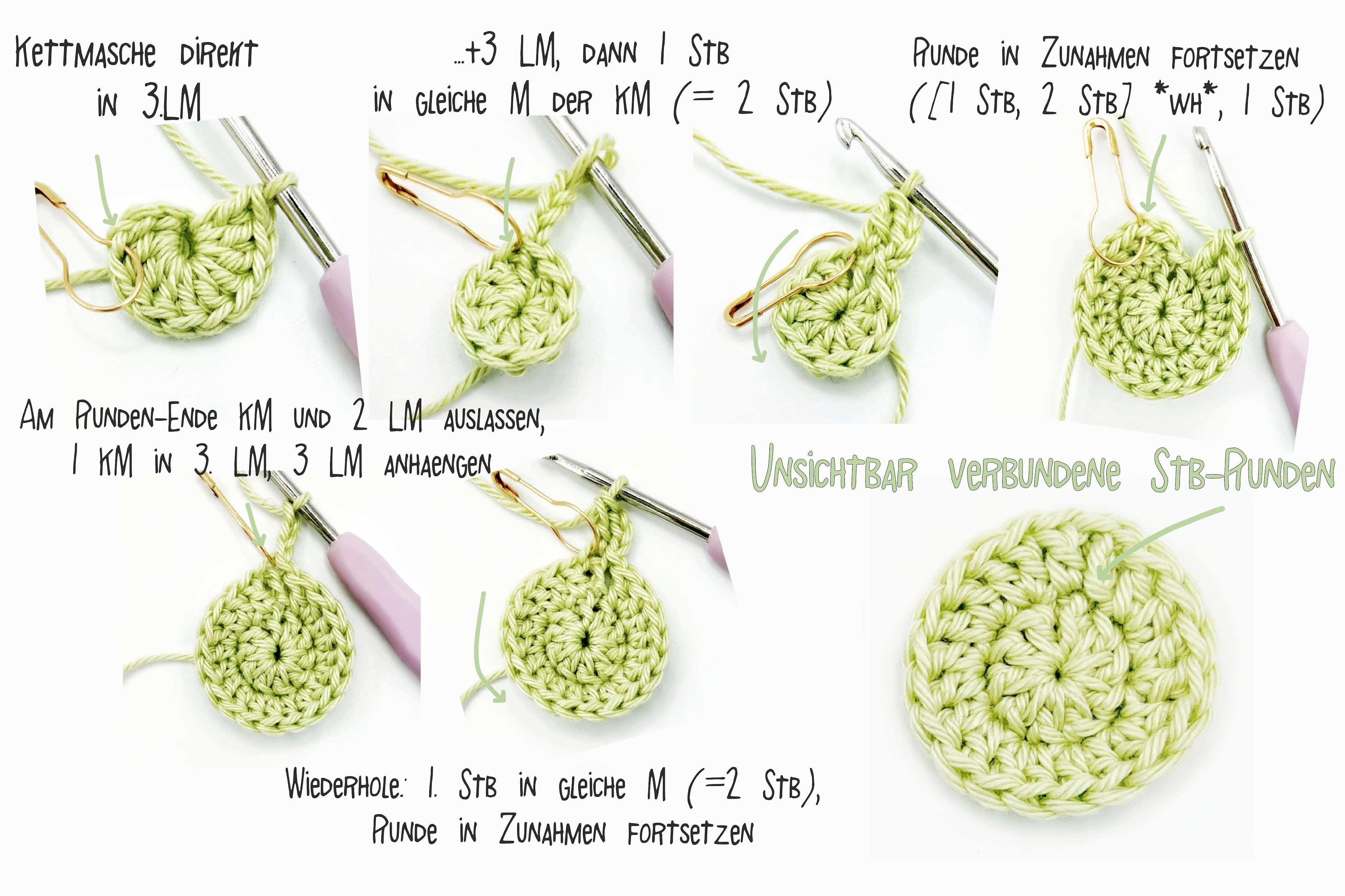 Wichtig: bei Zunahme-Runden werden die Verbindungsstelle (Start-KM auslassen, KM in oberste LM häkeln, LM anfügen) und die erste Masche der neuen Runde an derselben Position gehäkelt, sodass sie eine Zunahme (d.h. 2 M) darstellen.