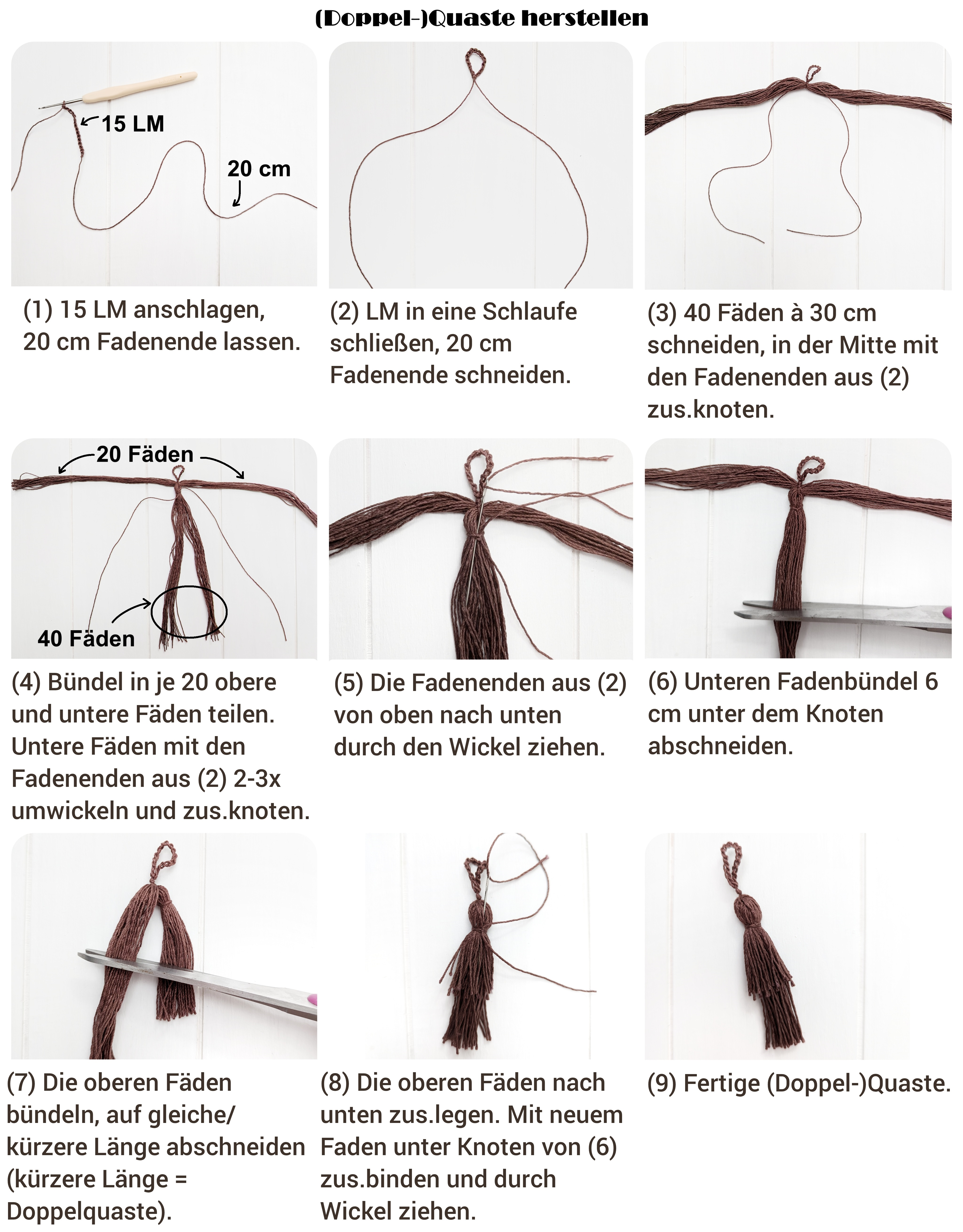 - Für die Quaste lasse die Öse am Reißverschluss und entferne den Rest mit einer Zange. Quaste anfertigen und durch die Öse ziehen. Sollte dein Reißverschluss keine Öse haben sondern nur eine kleine Öffnung, ziehe die Luftmaschenkette zu Beginn der Quastenerstellung durch diese Öffnung und mache dann die Quaste zu Ende.