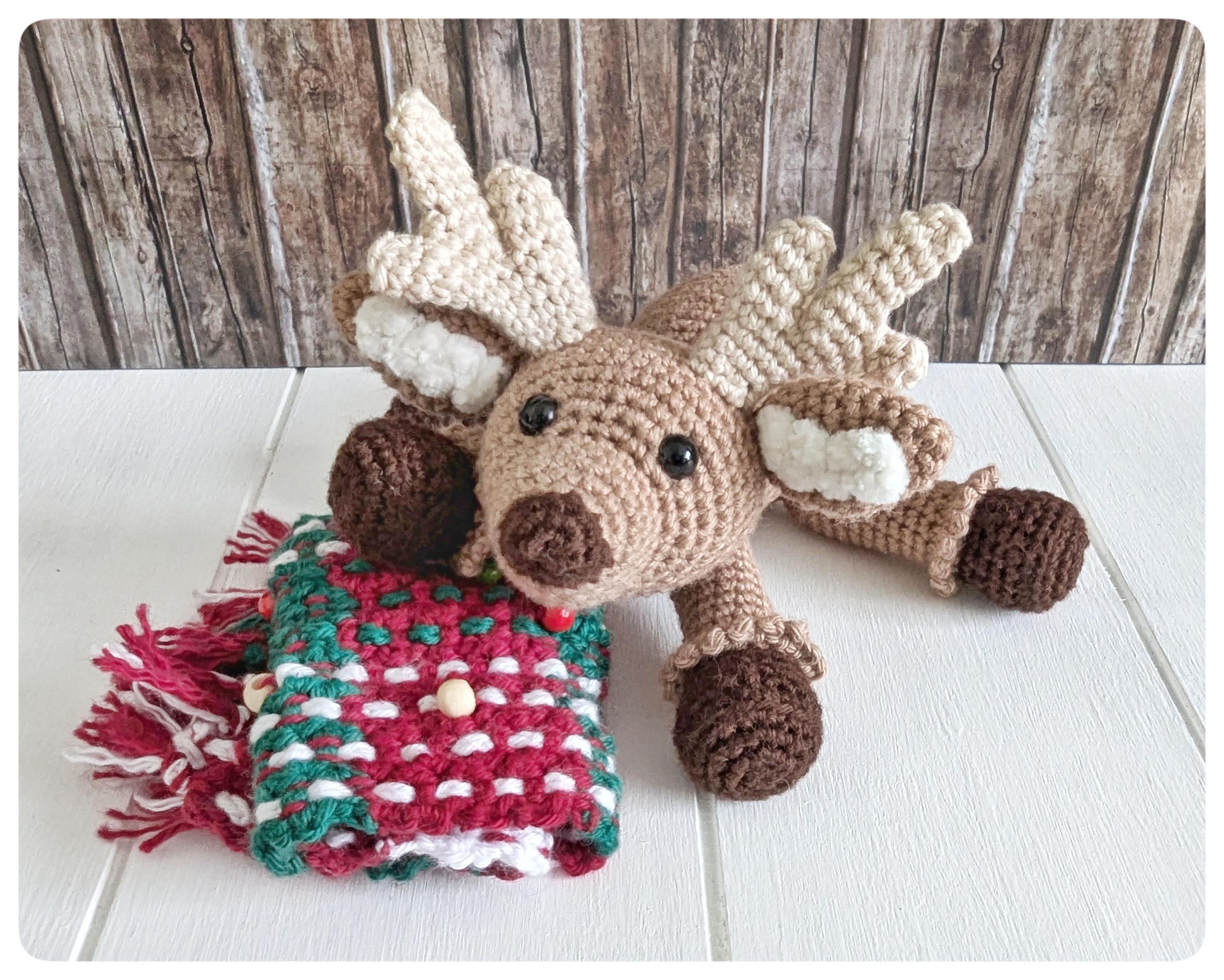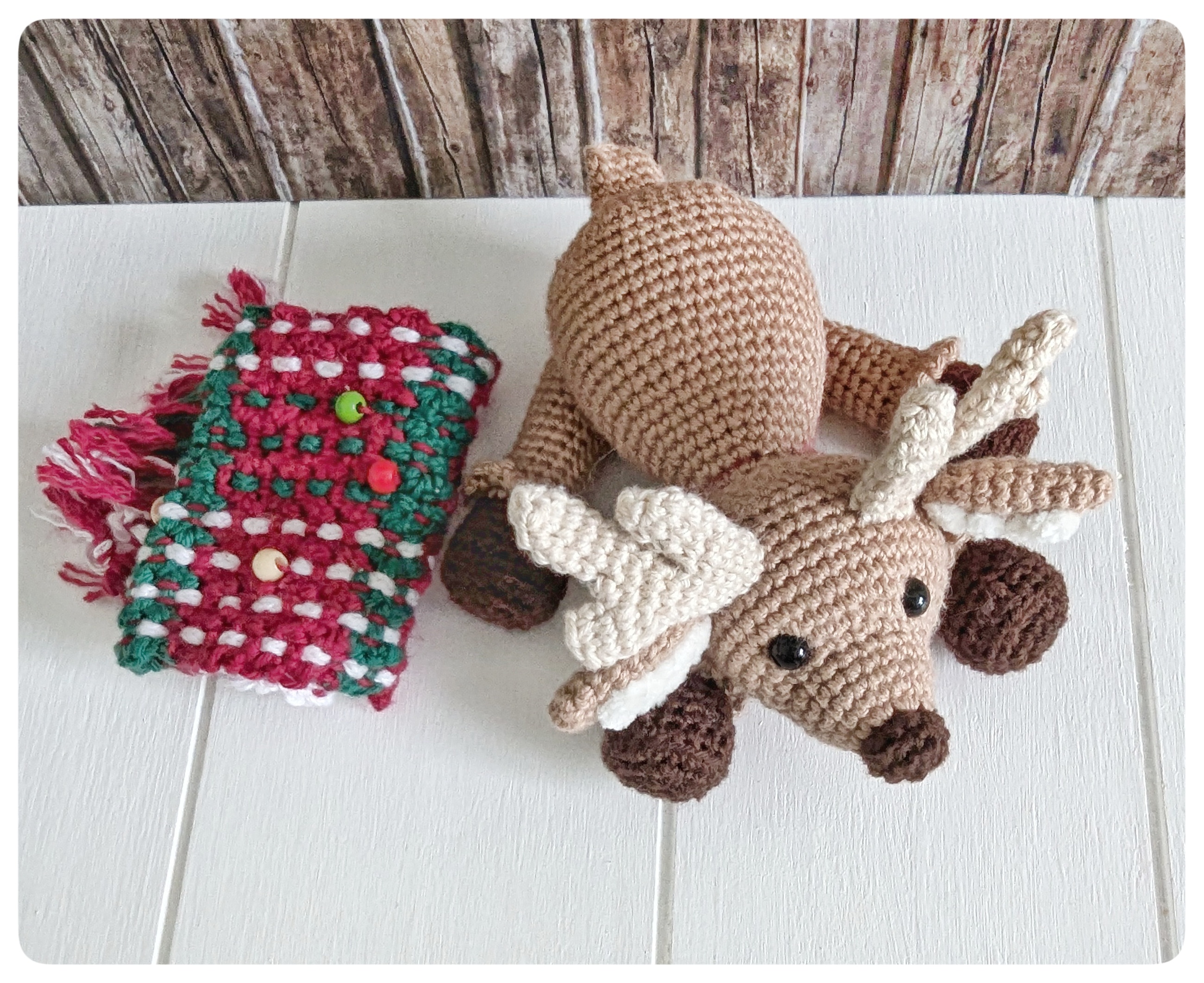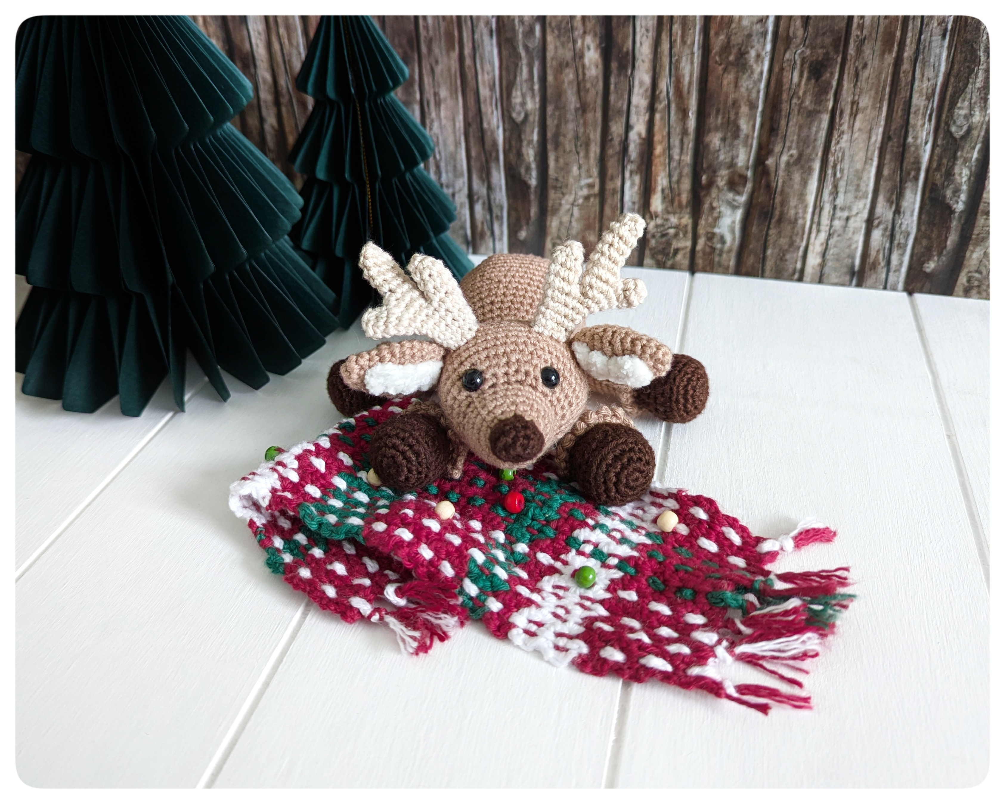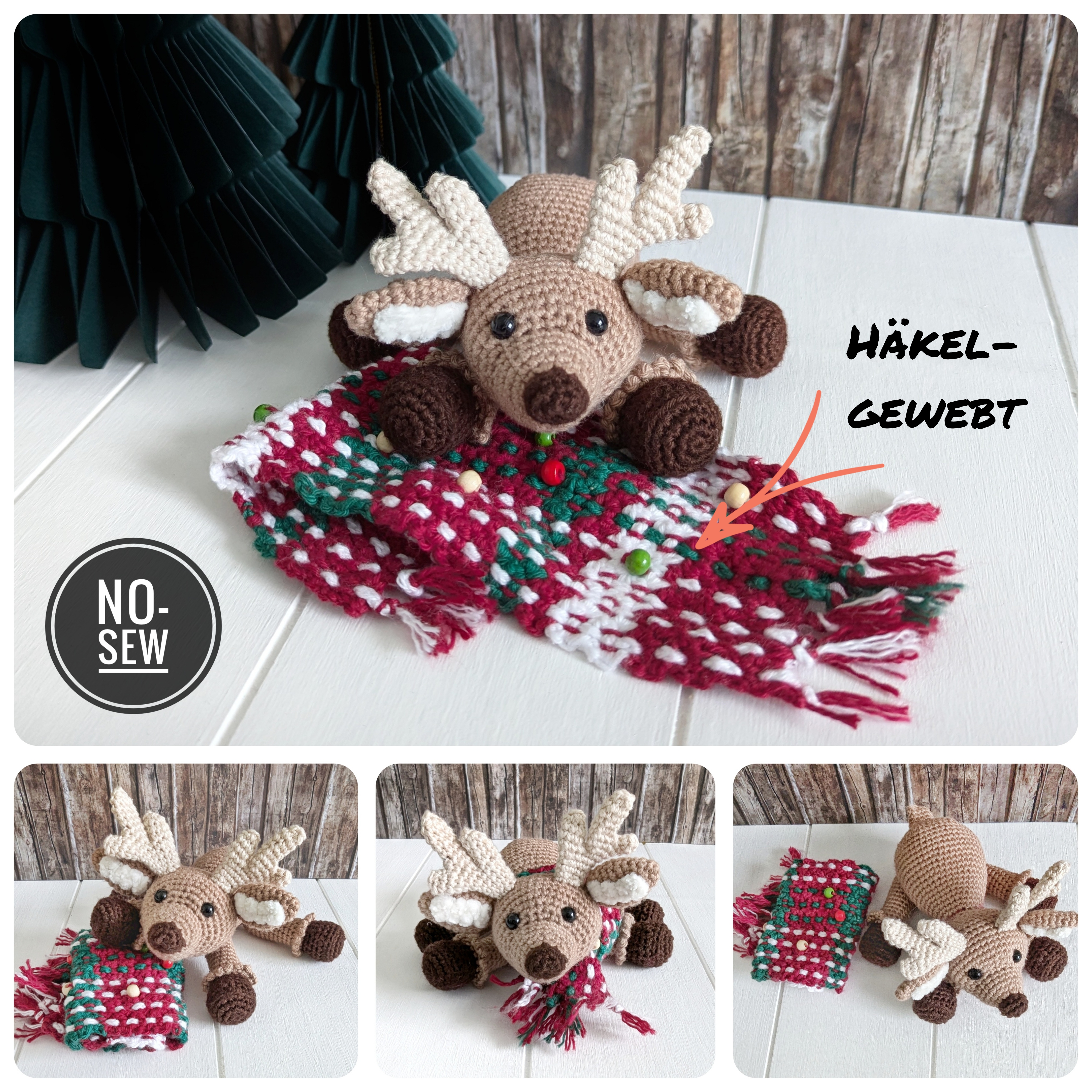 Ein besonderes Highlight dieses Musters ist der XL häkelgewebte Schal, der deinem Rentier einen gemütlichen, festlichen Look verleiht. Der Schal kombiniert sowohl Häkeln als auch Weben, aber dafür sind keine speziellen Kenntnisse oder Werkzeuge erforderlich. Alles, was du wissen musst, wird in der Anleitung erklärt und gezeigt. Der häkelgewebte Effekt verleiht deinem Rentier eine einzigartige, handgemachte Note und macht es zu etwas ganz Besonderem.