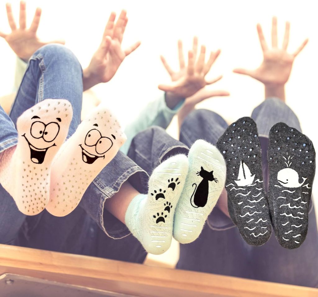 Besonders bei Socken oder Hausschuhen für Ältere und Kleinkinder empfiehlt sich noch eine Anti-Rutsch-Lösung für die Sohlen, um den Socken mehr Halt am Boden zu geben. Dafür können Sockenstopp Textilfarbe, Gummimilch, oder Anti-Rutsch Pads zum Aufbügeln (oder Annähen, falls das Angebügelte auf dem Sockenmaterial nicht gut haften sollte) auf die Sohlen gelegt werden.