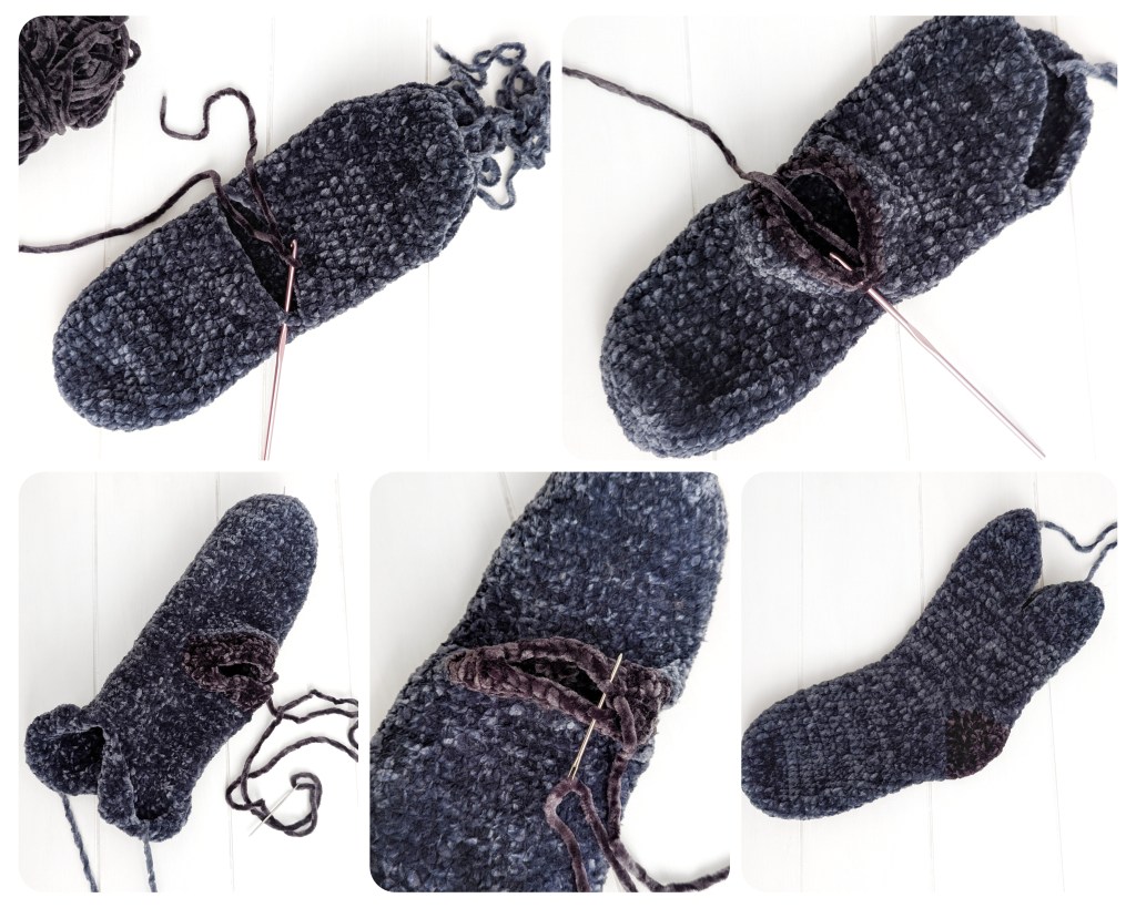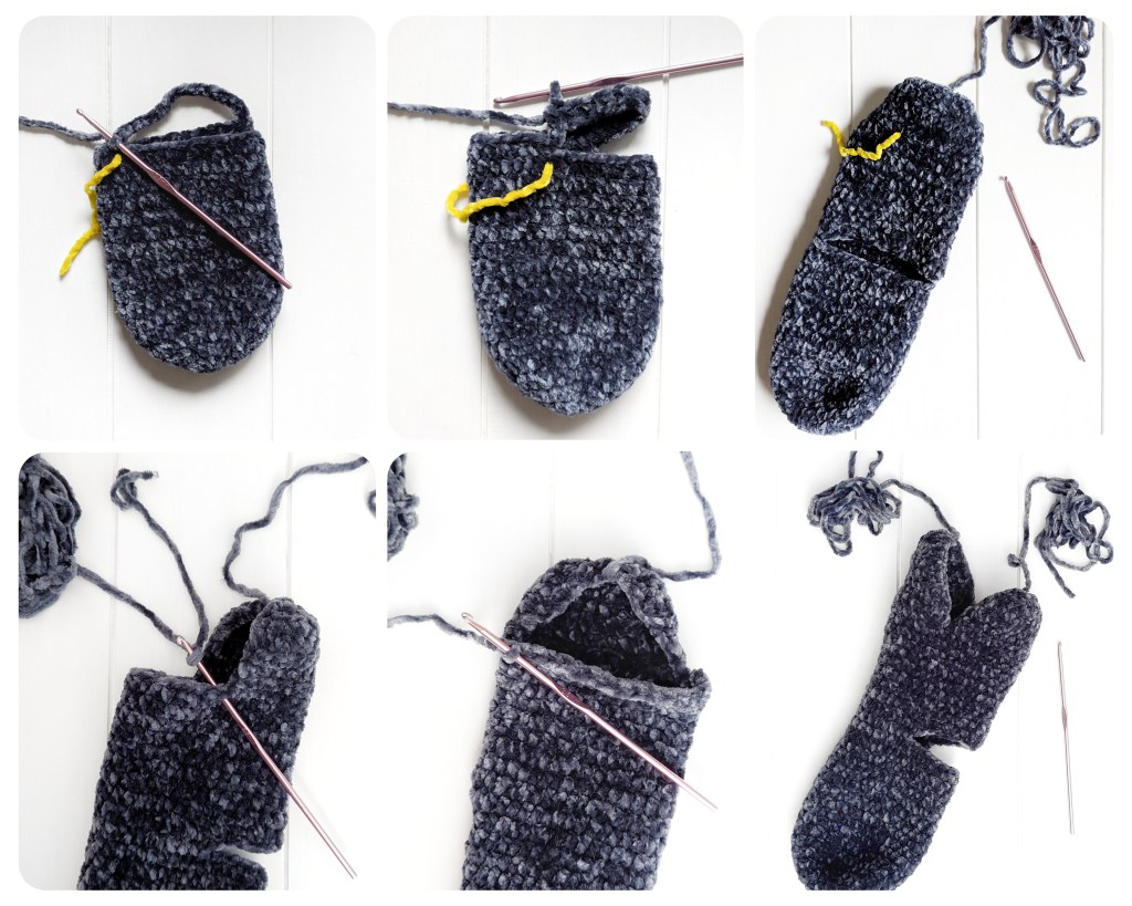 - flauschiges Garn. Ich habe Bohème Velvet Double von Go Handmade verwendet (100% Polyester) und eine Häkelnadel von 3,5 mm. Für kindergroße Socken (27/28) werden etwa 2 Garnbälle verwendet.