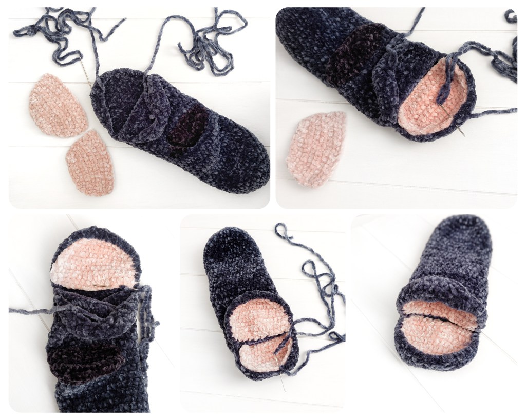 Statt mehreren Applikationen kann auch ein Sohlenboden von den Ferse bis zu den Zehenspitzen reichend in robusterem Garn nachgehäkelt werden, der dann wie eine Schuhsohle am Ende außen auf die Socke oder den Hausschuh angenäht wird. Für den besonderen Look und mehr Sicherheit.