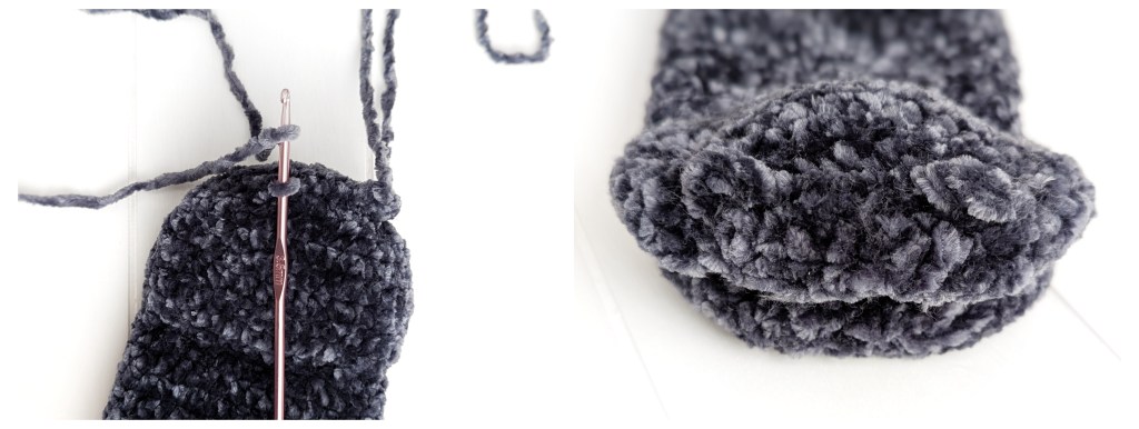 Nimm ein neues blaues Garn und steche in die vorderen Maschen (flo) der 8. Runde des äußeren Oberkiefers ein. 1 LM, 1 fM in die gleiche Masche wie 1-LM, 1 hStb in das nächste vMg, 1 fM in das letzte vMg auf der rechten Seite. Ziehe die Enden nach innen in den Kiefer, verknote sie und verstecke die Enden im Inneren.