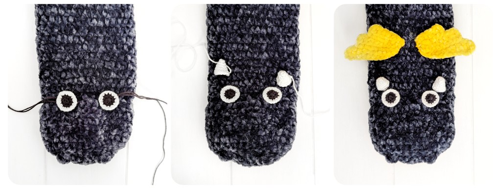 Für die Flügel habe ich die Anleitung vom No-Sew Drachen verwendet und sie ca. 4-5 Reihen oberhalb der Hörner mittig angenäht.