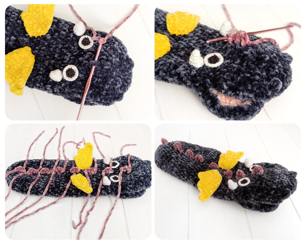 Die Rückendornen bestehen aus 8 Blöcken, die in der Mitte des Rückens über die Runden hinweg gehäkelt werden. Die Blöcke sind durch 2 leere Runden getrennt.