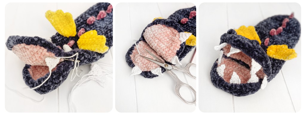 Wiederhole weitere 7x. Mithilfe einer Wollnadel und der Fadenenden nähe die Zähne in abwechselnden Abständen an den Farbübergang zwischen Außen -und Innen Oberkiefer.