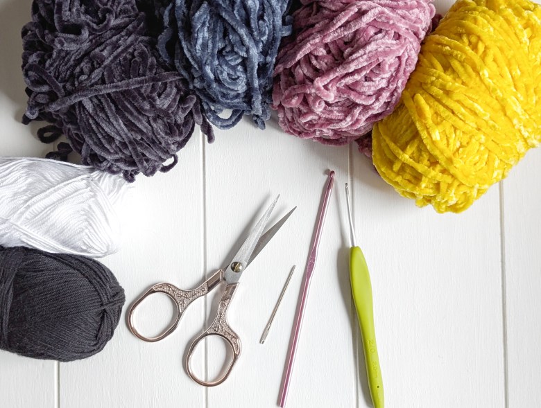 - zusätzlich dünnes festes Garn für die Augen, Hörner und Zähne, z.B. Sockengarn. Ich habe Rainbow Deluxe 8/4 von Hobbii (2,5 – 3 mm empfohlene Nadelstärke) verwendet und dazu eine Häkelnadel von 2,0 mm.