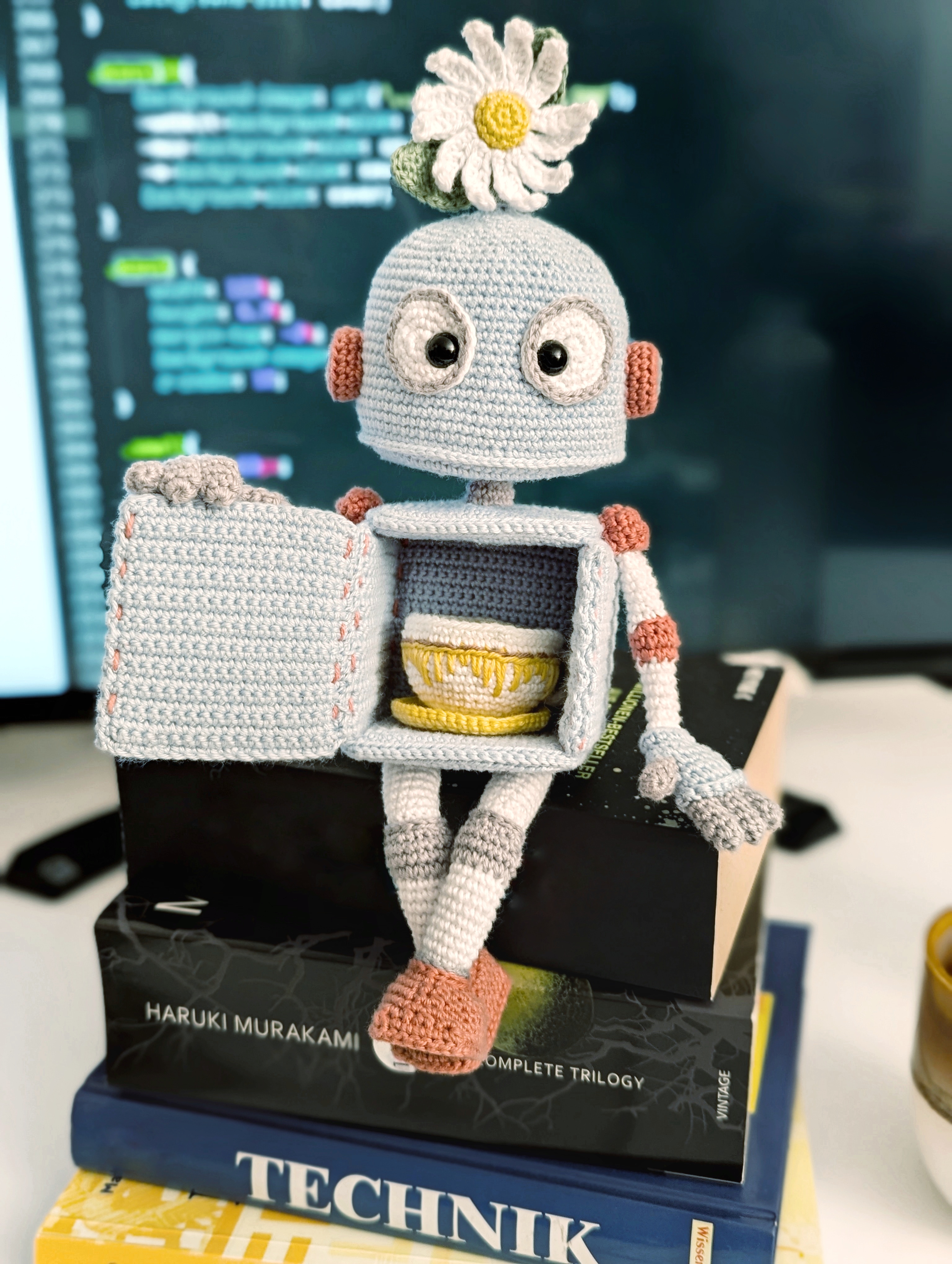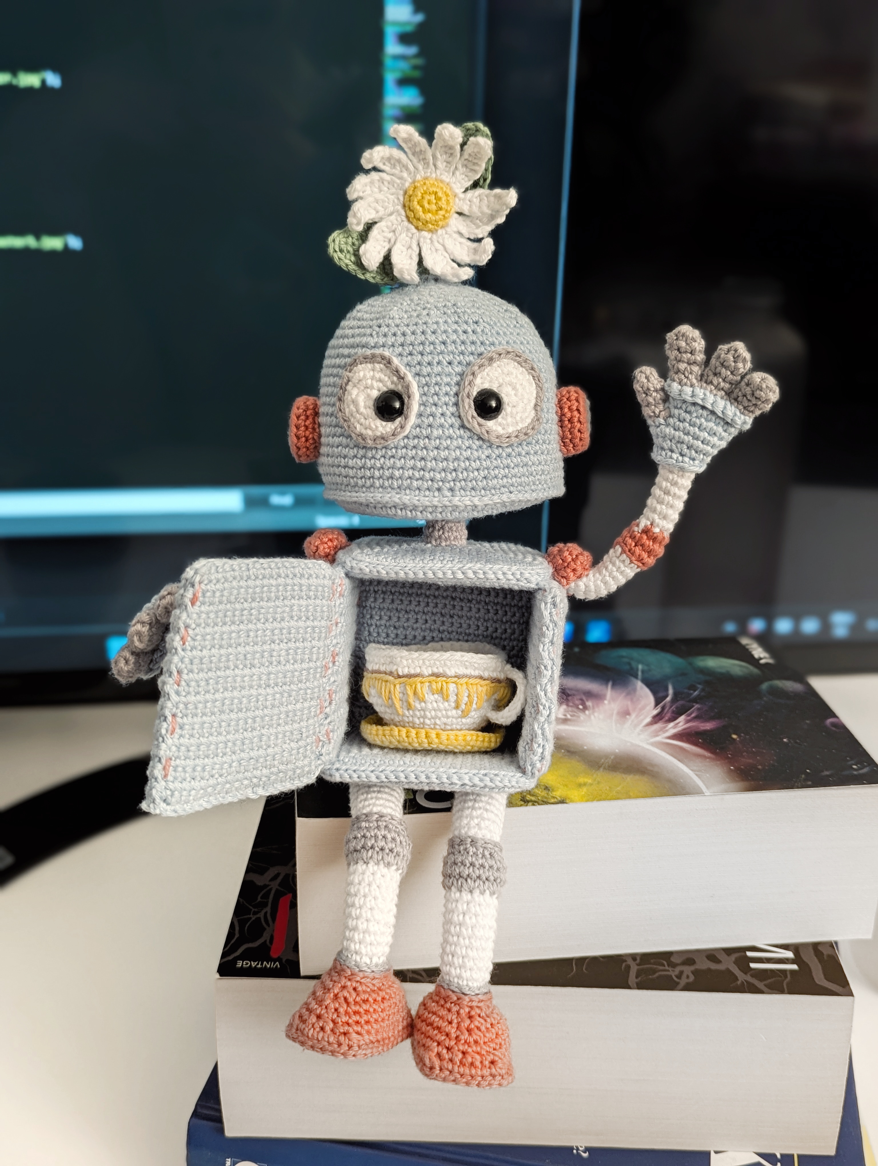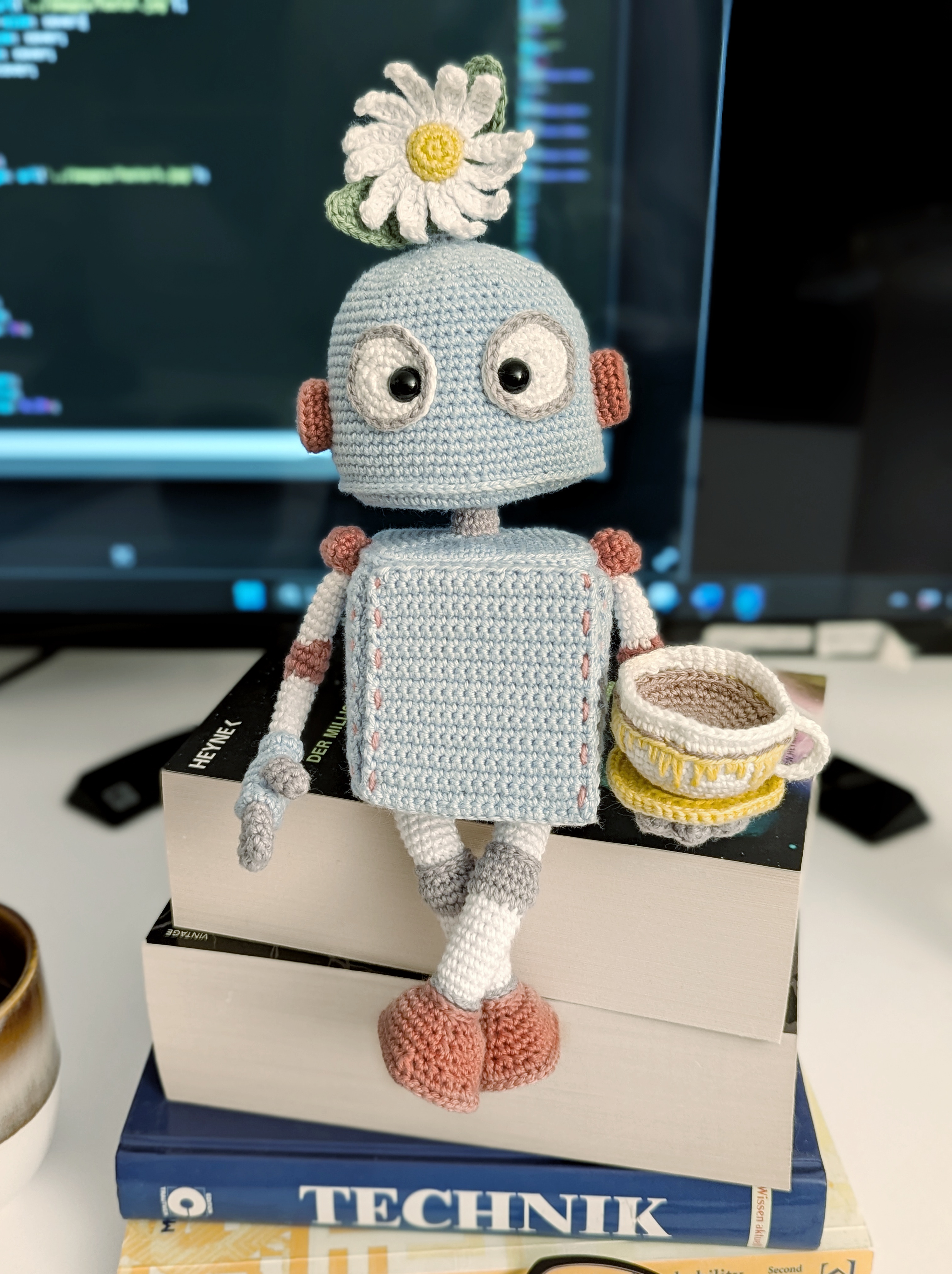 BrewBot ist aus Garn, ein paar Kartonstücken, Basteldraht und viel Liebe gemacht. Mit dem flexiblen Draht kann dieser 27 cm große Kumpel eigenständig an deinem Schreibtisch stehen oder sitzen. Seine lebendigen Farben und die zarte Margeritenblume sollen dir Freude bereiten, während du dich dennoch auf deine Arbeit konzentrieren kannst. Aber der wahre Büro-Trick ist sein Bauch: Du kannst ihn öffnen und darin findest du – eine perfekt gebrühte Tasse Kaffee. Denn selbst Roboter wissen, dass Produktivität auf Koffein läuft.
