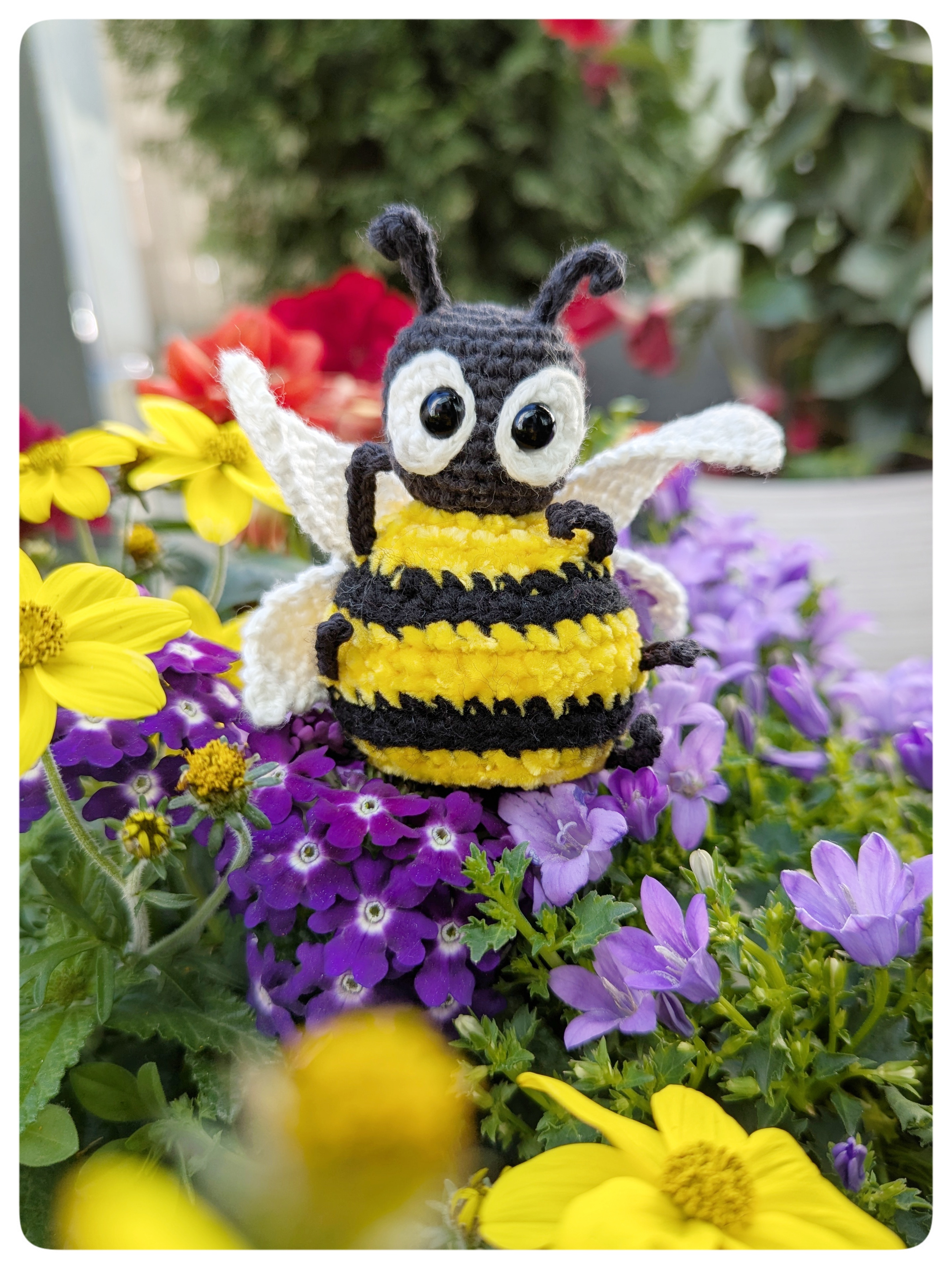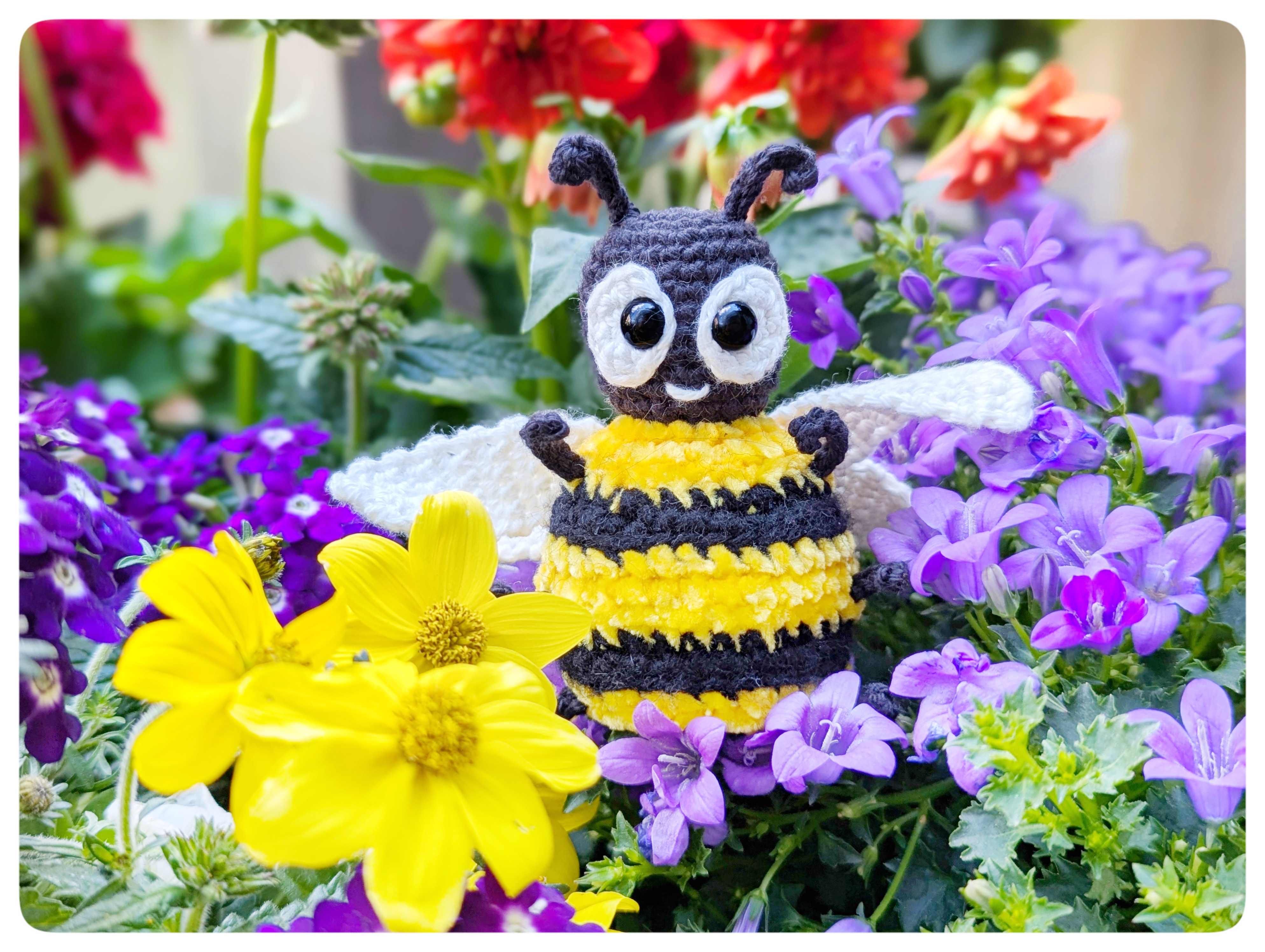 Der Sommer summt naht und wo die Blumen wachsen, sind sie nicht weit: die Bienen. Nach einem langen Winter sitzen sie nun glücklich auf dem Blumenbeet, fressen sich das Bäuchlein voll mit Nektar und Pollen und genießen die Sonnenstrahlen. So auch dieses süße Kerlchen: Sumsi, die Häkelbiene.