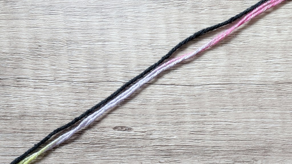 Farbwechsel auf 2-Fäden des Obermaterial-Garns. Mit Obermaterial-Seite häkeln fortsetzen.