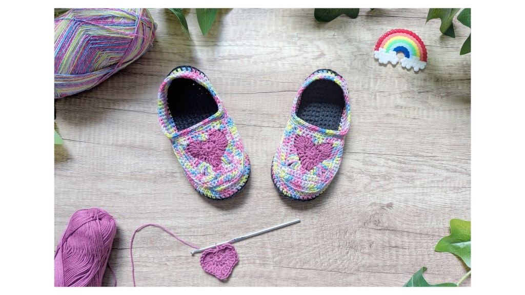 Also habe ich mit Garn experimentiert. Die Sohle sollte stabil und etwas kräftiger sein, das Obermaterial dagegen leichter, fast wie bei einem klassischen Turnschuh, der sich leicht nach innen wölbt. Für die Sohle habe ich ein robustes Baumwollgarn genommen und mit doppeltem Faden gearbeitet. Für das Obermaterial kam ein ebenfalls doppelt gehäkeltes Fingering-Garn zum Einsatz – aus Polyacryl, mit einem Hauch Glitzer (weil ein bisschen Funkeln den Alltag einfach schöner macht). Durch diese Garnkombi entsteht eine schöne Turnschuhoptik: fest unten, leicht und flexibel oben. Dazu ein individuelles Granny Square, damit auch das Lieblingsmotiv Platz am Schuh hat, und fertig ist der Turnschuhlook zum Wohlfühlen.