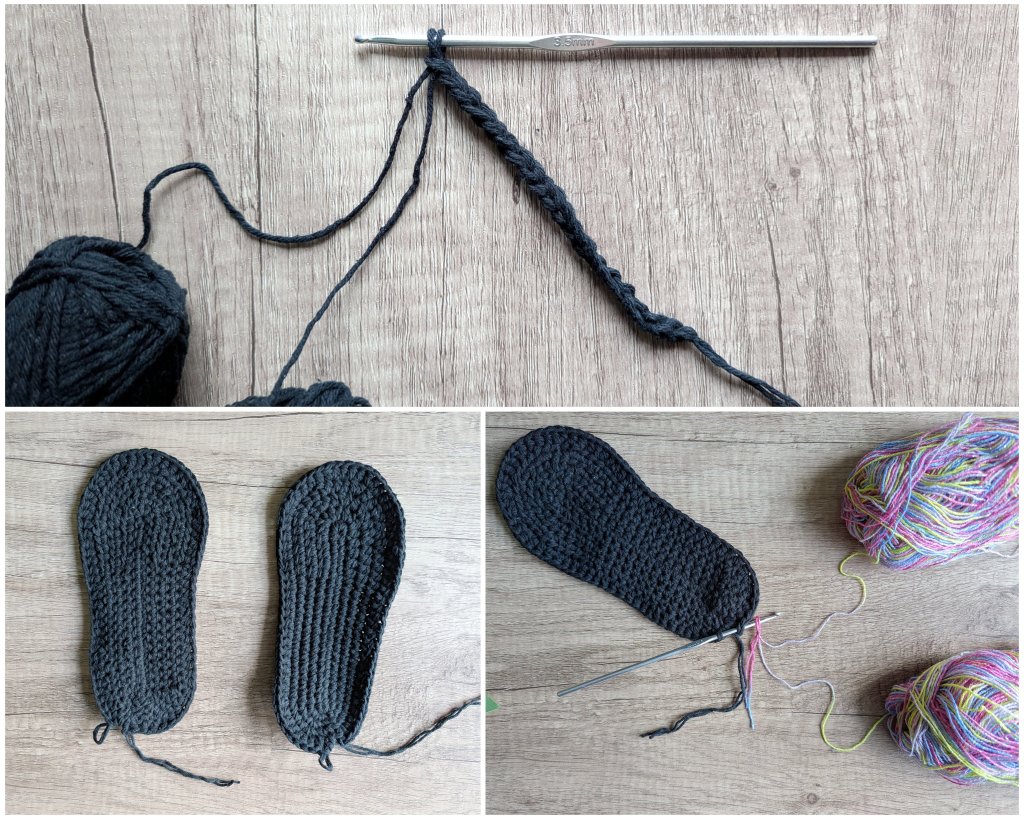 Damit der Schuh bei passender Sohlenlänge eng am Fuß anliegt verwendet man ein Garn als Obermaterial, das nur halb so dick ist wie das Garn für die Sohle! Häkelt man mit gleichem Garn bekommt man einen gewöhnlichen Häkelschuh – damit funktioniert diese Anleitung hier auch wunderbar, wenn man ein breiteres Schuhwerk machen will.
