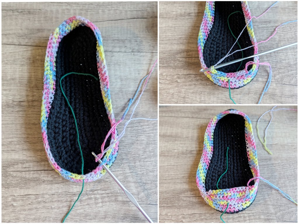 Die Größe 25/26 enden hier. Farbwechsel auf 2-Fäden des Obermaterial-Garns. Mit Obermaterial-Seite häkeln fortsetzen.