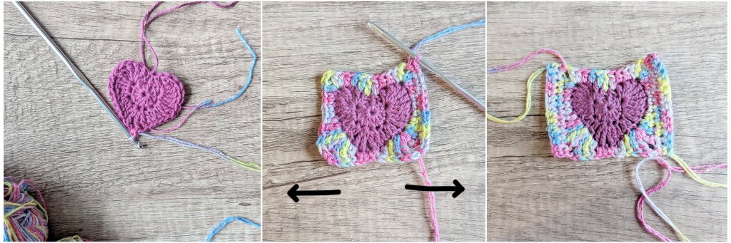Gut eignet sich ein traditionelles Granny Square oder dieses florale Granny Square (nur bis zur 6.Rd gehäkelt und mit 2-Lm an jeder Ecke statt 3-Lm). Ich habe dieses Herz Granny Square von Adore Crea verwendet (ohne Rd 4!), da meine Töchter Herzchen sehr mögen. Aber im Grunde kann man jedes andere beliebige Muster verwenden.