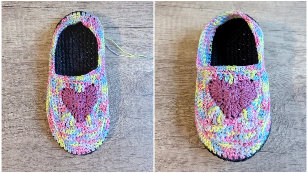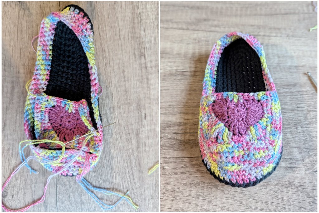 Das Granny Square wird unten an die Fußspitze und entlang der Seiten an den Schuh angenäht. Dabei wird jeweils nur 1 Maschenglied erfasst, damit die Verbindungsnaht nicht zu dick wird. Ich habe seitlich vom Schuh durch die inneren Maschenglieder genäht, damit an der Seite ein Maschengliedrand ähnlich wie bei der Fußspitze sichtbar wird.