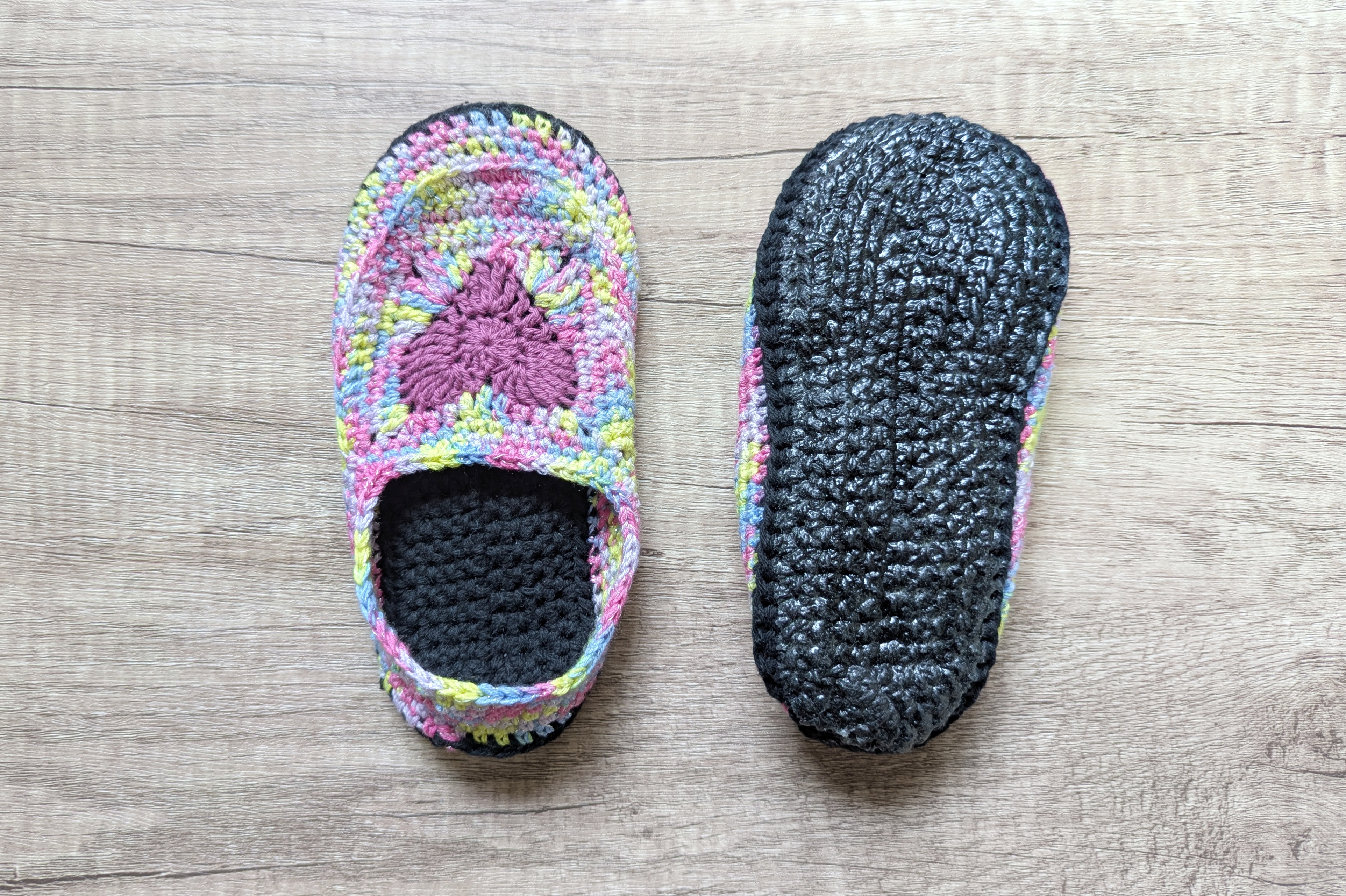 In der Größe 25/26 können noch 1-2 Runden aus festen Maschen um den Knöchel gehäkelt werden, damit der Schuh etwas enger sitzt. In den größeren Größen 2-3 Runden häkeln (am Produktfoto, in Größe 27/28, sind 3 Runden ab dem Granny Square dazugehäkelt). Fadenende vernähen.