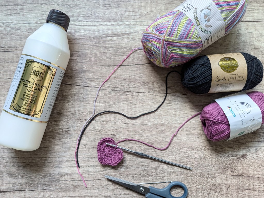 - Für das Obermaterial: Sockengarn aus einer Polyacryl- oder Polyester-Mischung (Maschenprobe: mit Häkelnadel 3,5 mm und doppeltem Faden 10 M und 14 R auf 5 x 5 cm), z.B. Unicorn Dream from Handmade with Love.