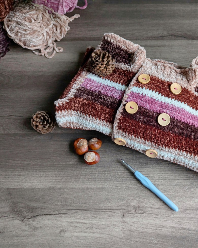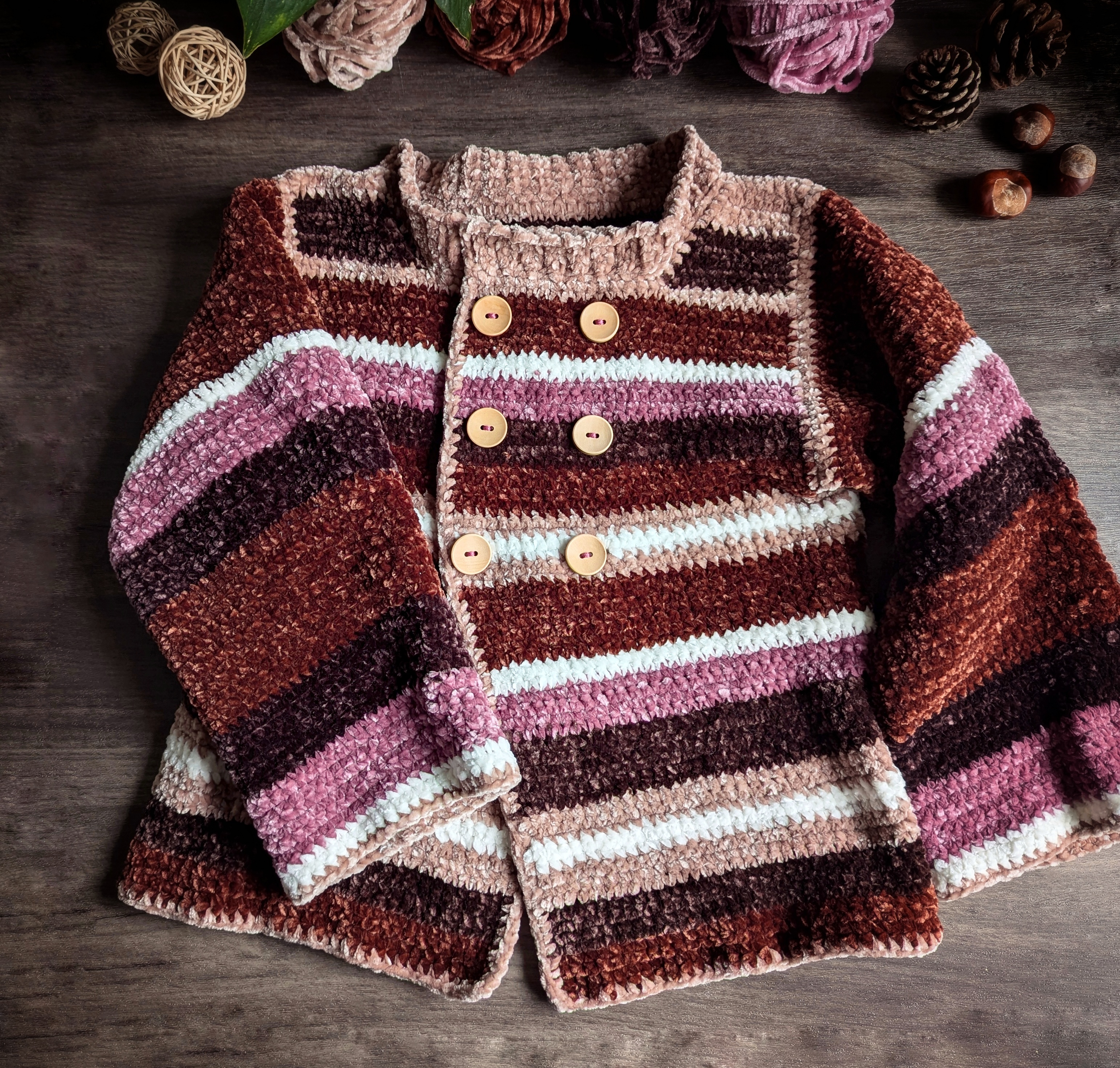Die Jacke ist nicht nur kuschelig warm und anschmiegsam, sondern auch richtig stylisch – in erdigen Herbstfarben, die perfekt zu Spaziergängen durch raschelndes Laub passen. Das Plüschgarn sorgt für eine samtige, luftige Oberfläche, während das dichte Häkelmuster aus festen Maschen die Kleinsten bestens vor Kälte schützt– ideal für die Übergangszeit, wenn es morgens schon frisch, aber nachmittags noch mild ist.