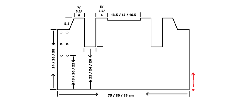Armausschnitt: Nach 22/24/26 cm Gesamthöhe werden zunächst 28/30/32 M für das rechte Vorderteil (Knopfseite) gearbeitet, dann 8 KM (rechter Armausschnitt), dann 41/45/49 M Rückenteil, dann 8 KM (linker Armausschnitt), dann 28/30/32 M linkes Vorderteil (Knopfloch-Seite).
