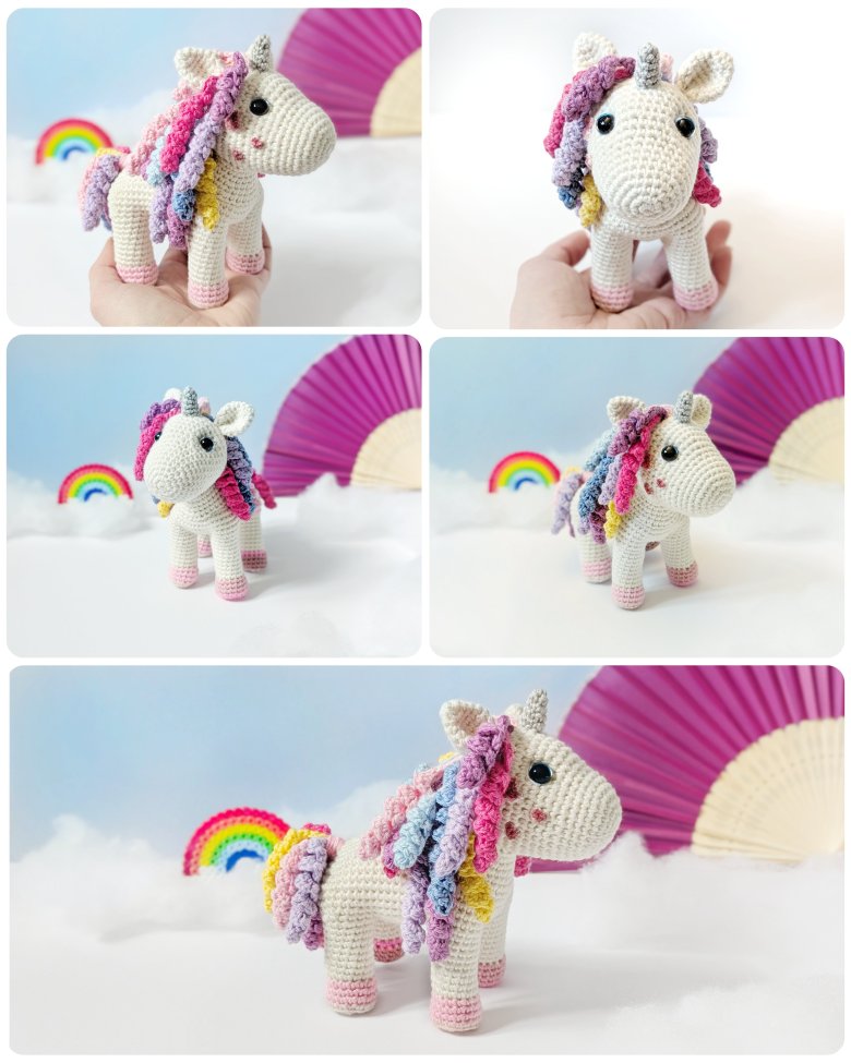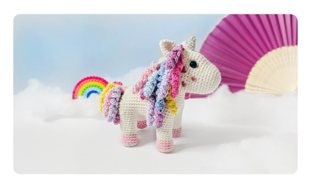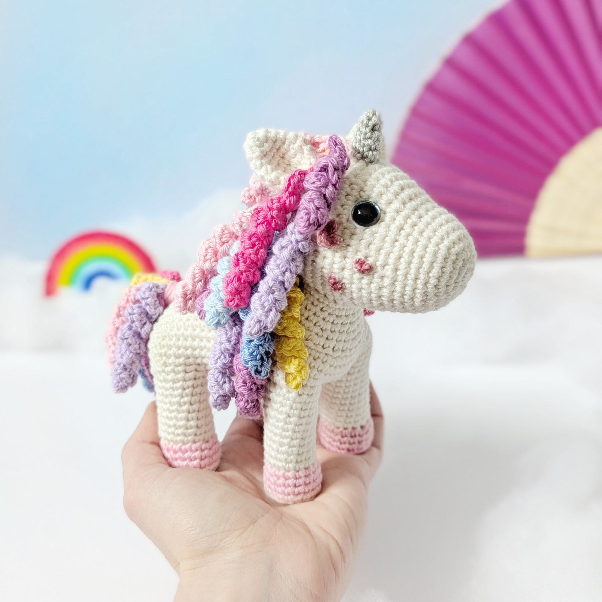 Ob als kleines, filigranes Amigurumi, süßes DIY-Spielzeugpferd oder als großes, kuscheliges Plüsch-Einhorn. Die Anleitung ist flexibel und kann mit verschiedenen Garnstärken gearbeitet werden – von super fine bis super bulky. Hinweise zur Anpassung bei voluminösem Garn sind enthalten.