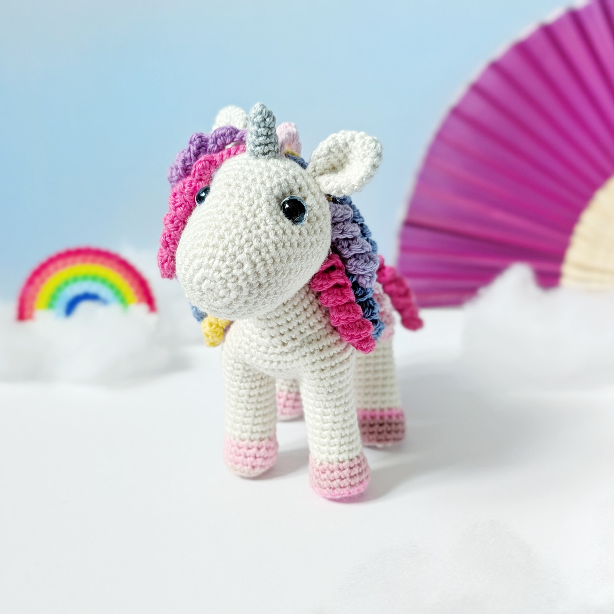 Das Leben ist schöner mit einer ordentlichen Portion Farbe! Mit diesem Gedanken ist dieses Regenbogen-Einhorn Amigurumi entstanden: mit farbenfroher Regenbogen-Mähne, buschigem Schweif und zarten Herz-Wangen ist es ein liebevolles Detailstück für alle, die Einhörner, Regenbogen und Herzen lieben. Ein echter Blickfang und perfekt als Geschenk zu einer Babyparty, zum Geburtstag oder als dekoratives Highlight im Kinderzimmer.